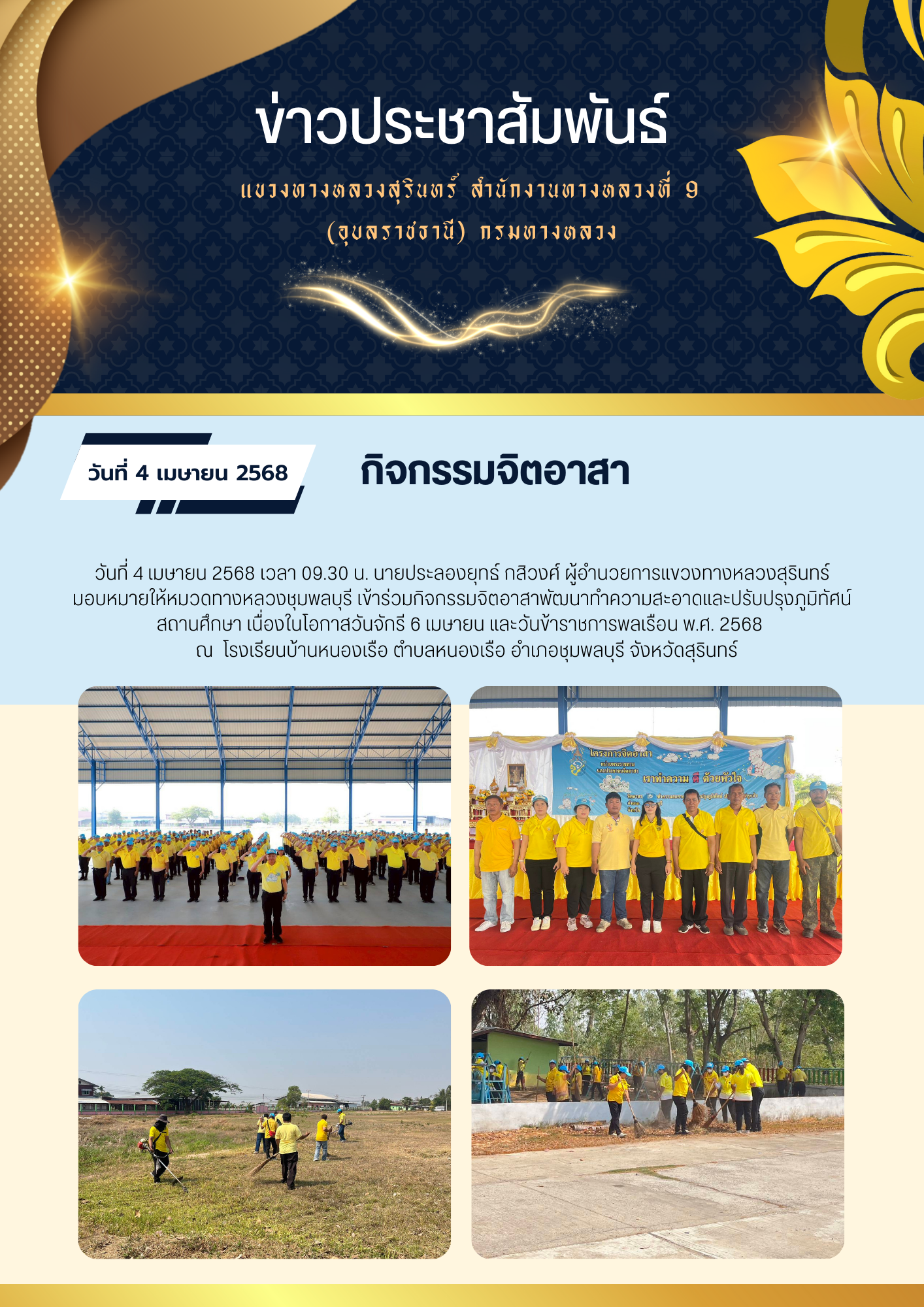 ร่วมกิจกรรมจิตอาสาทำความสะอาดและปรับปรุงภูมิทัศน์ศาสนสถาน เนื่องในโอกาสวันคล้ายวันพระราชสมภพสมเด็จพระกนิษฐาธิราชเจ้า กรมสมเด็จพระเทพรัตนราชสุดาฯ