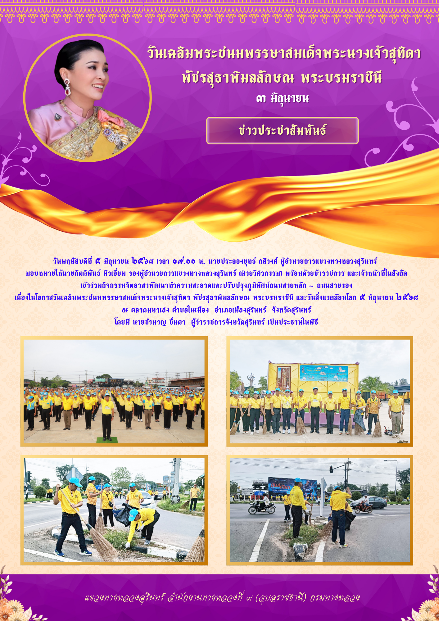 กิจกรรมจิตอาสาพัฒนาทำความสะอาดและปรับปรุงภูมิทัศน์ถนนสายหลัก - ถนนสายรอง เนื่องในโอกาสวันเฉลิมพระชนมพรรษาสมเด็จพระนางเจ้าสุทิดา พัชรสุธาพิมลลักษณ พระบรมราชินี และวันสิ่งแวดล้อมโลก ๕ มิถุนายน ๒๕๖๘