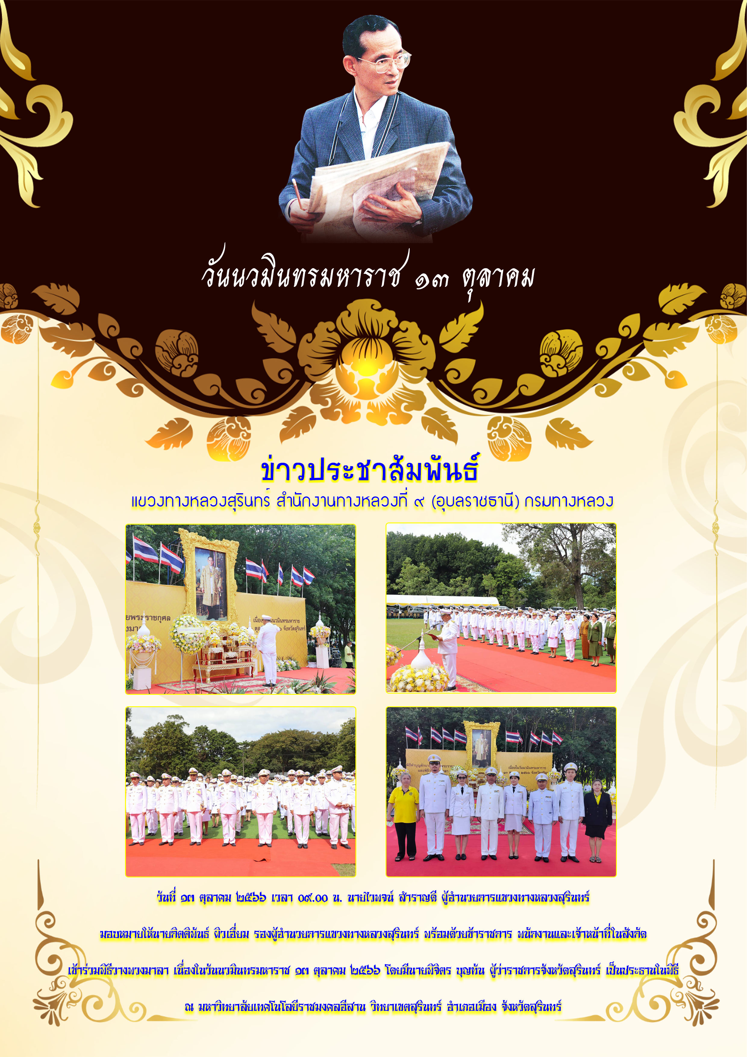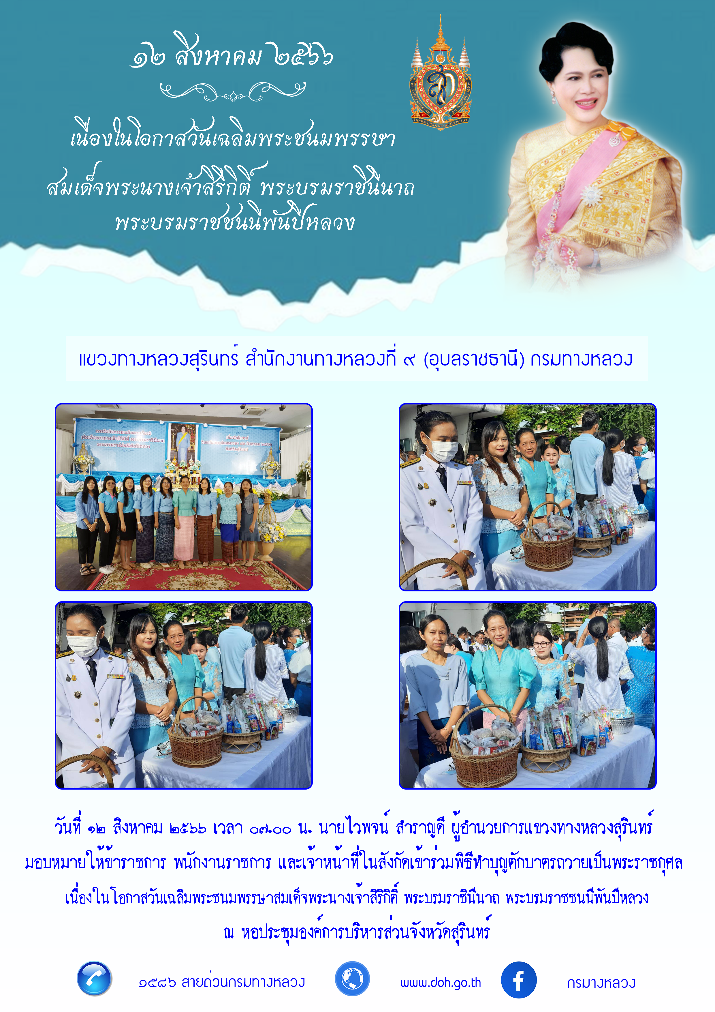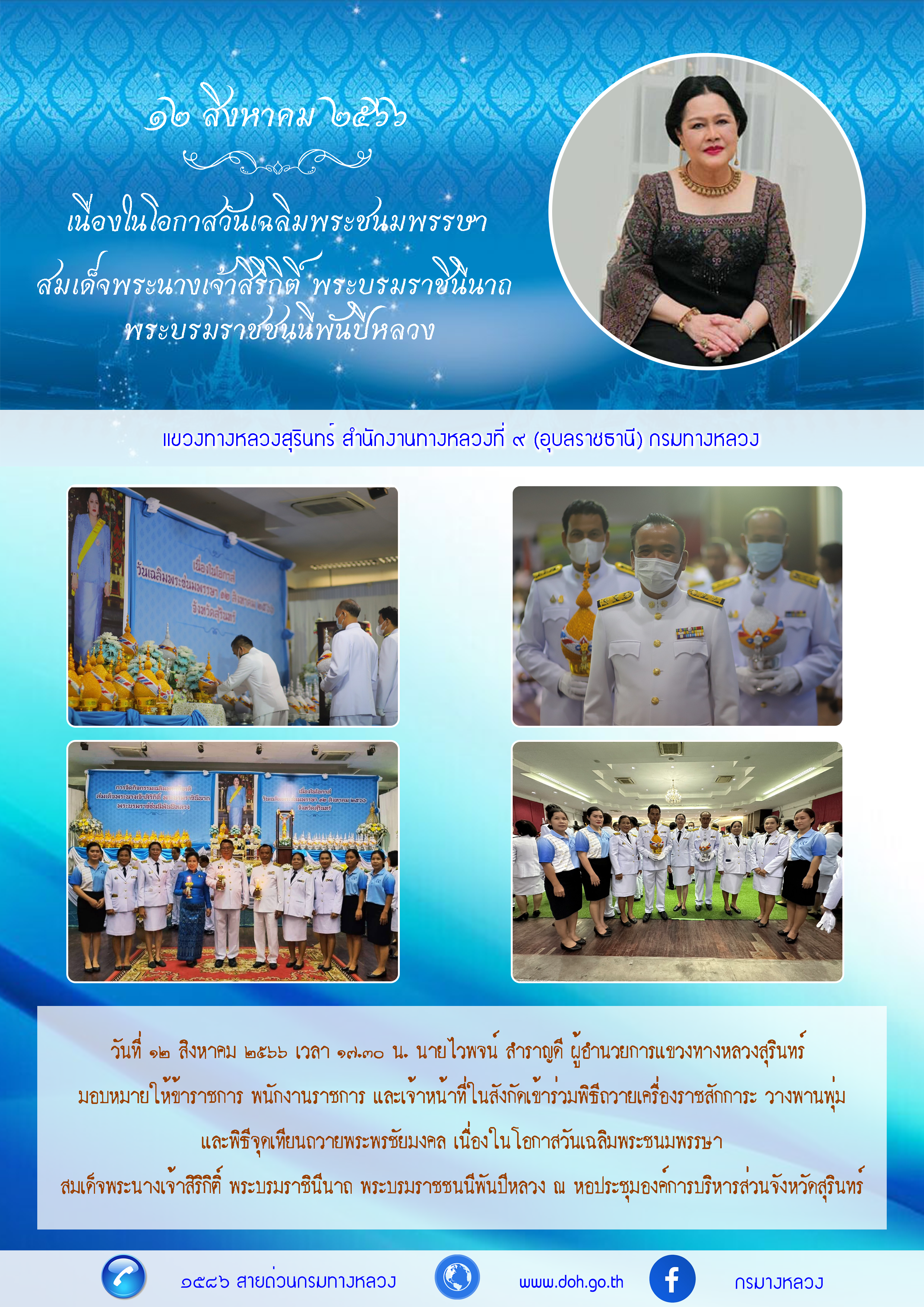นวยการแขวงทางหลวงสุรินทร์ มอบหมายให้ข้าราชการ พนักงานราชการ และเจ้าหน้าที่ในสังกัดเข้าร่วมพิธีถวายเครื่องราชสักการะ วางพานพุ่ม และพิธีจุดเทียนถวายพระพรชัยมงคล เนื่องในโอกาสวันเฉลิมพระชนมพรรษา สมเด็จพระนางเจ้าสิริกิติ์ พระบรมราชินีนาถ พระบรมราชชนนีพันปีหลวง