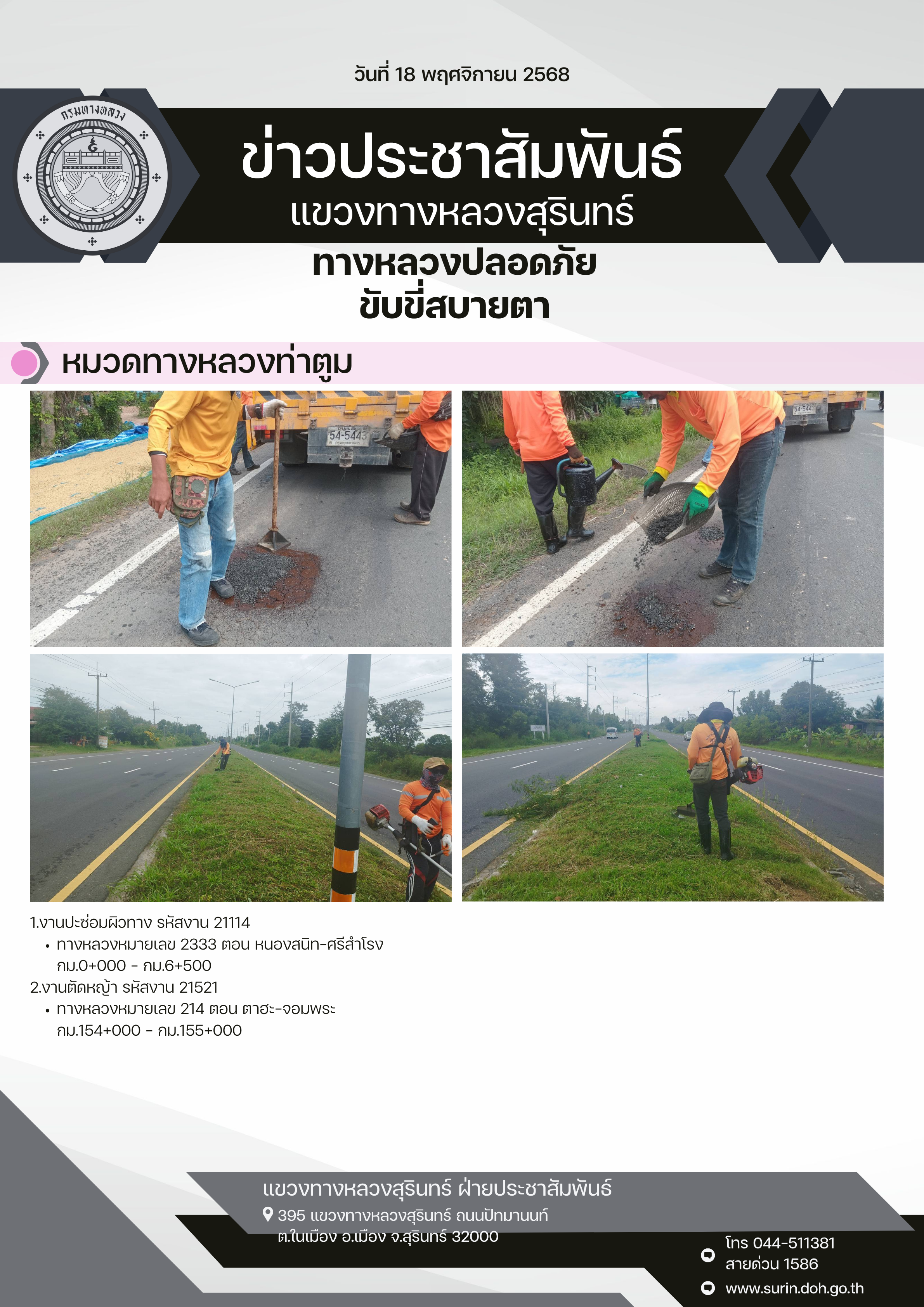 ทางหลวงปลอดภัย ขับขี่สบายตา 18 พฤศจิกายน 2568 |