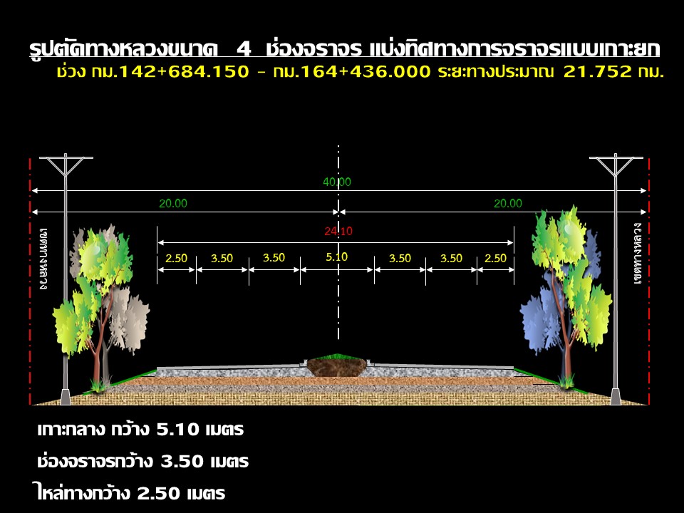 - ขยายทาง เดิมจาก 2 ช่องจราจร เป็น 4 ช่องจราจร พร้อมปรับปรุงเกาะกลางแบบเกาะสี 1.60 , 2.00 เมตรและเกาะยก 4.20 เมตร เป็นเกาะยกกว้าง 5.10 เมตร
