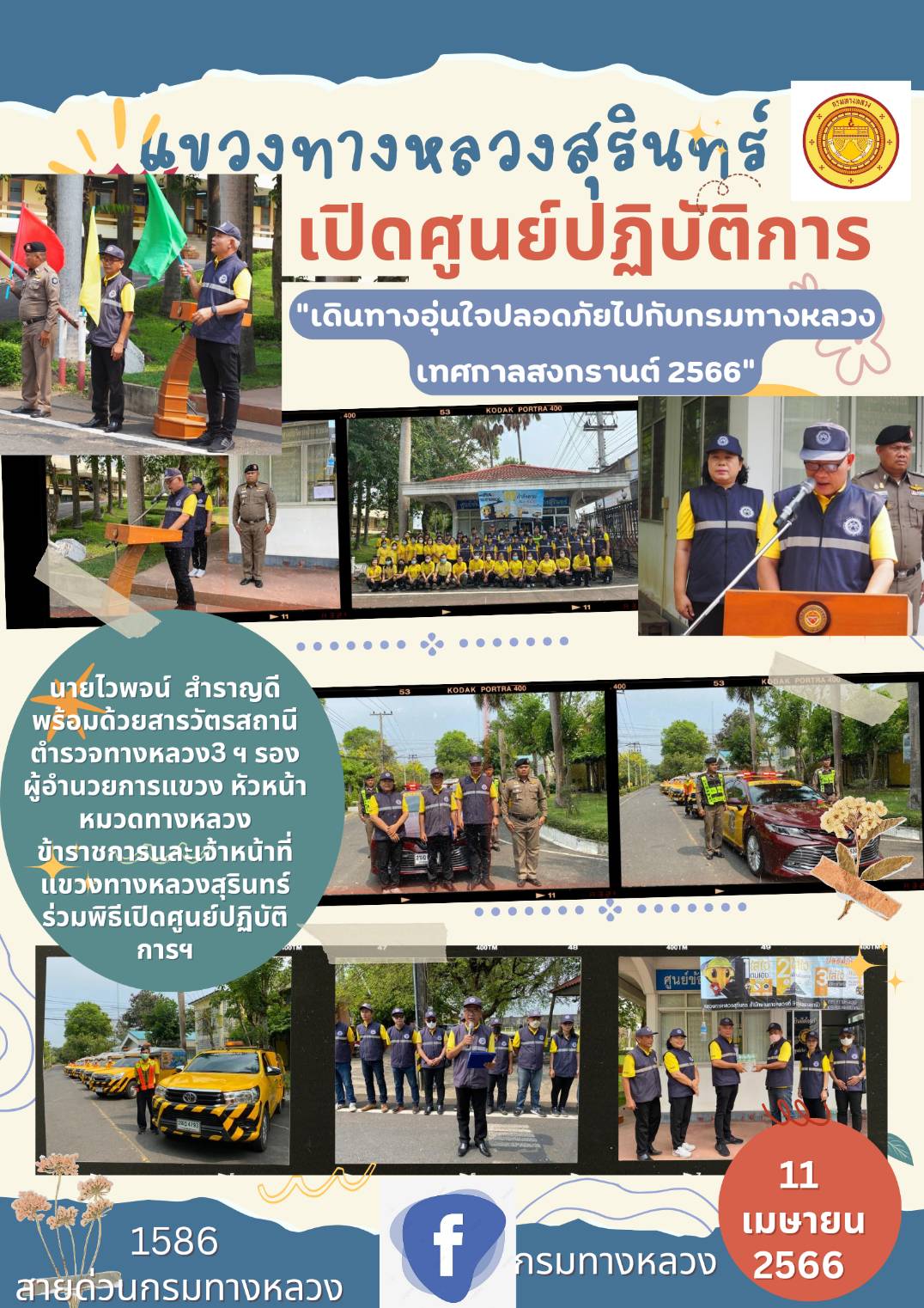 นายไวพจน์ สำราญดี ผู้อำนวยการแขวงทางหลวงสุรินทร์ พร้อมด้วยสารวัตรสถานีตำรวจทางหลวง 3 และเจ้าหน้าที่แขวงทางหลวงสุรินทร์ ร่วมพิธีเปิดศูนย์อำนวยความสะดวกและปลอดภัยเทศกาลสงกรานต์ 2566 ระหว่างวันที่ 11 - 18 เมษายน 2566 เพื่อให้บริการและอำนวยความสะดวกแก่ประชาชนผู้ใช้เส้นทาง ณ บริเวณหน้าศูนย์ข้อมูลข่าวสาร แขวงทางหลวงสุรินทร์