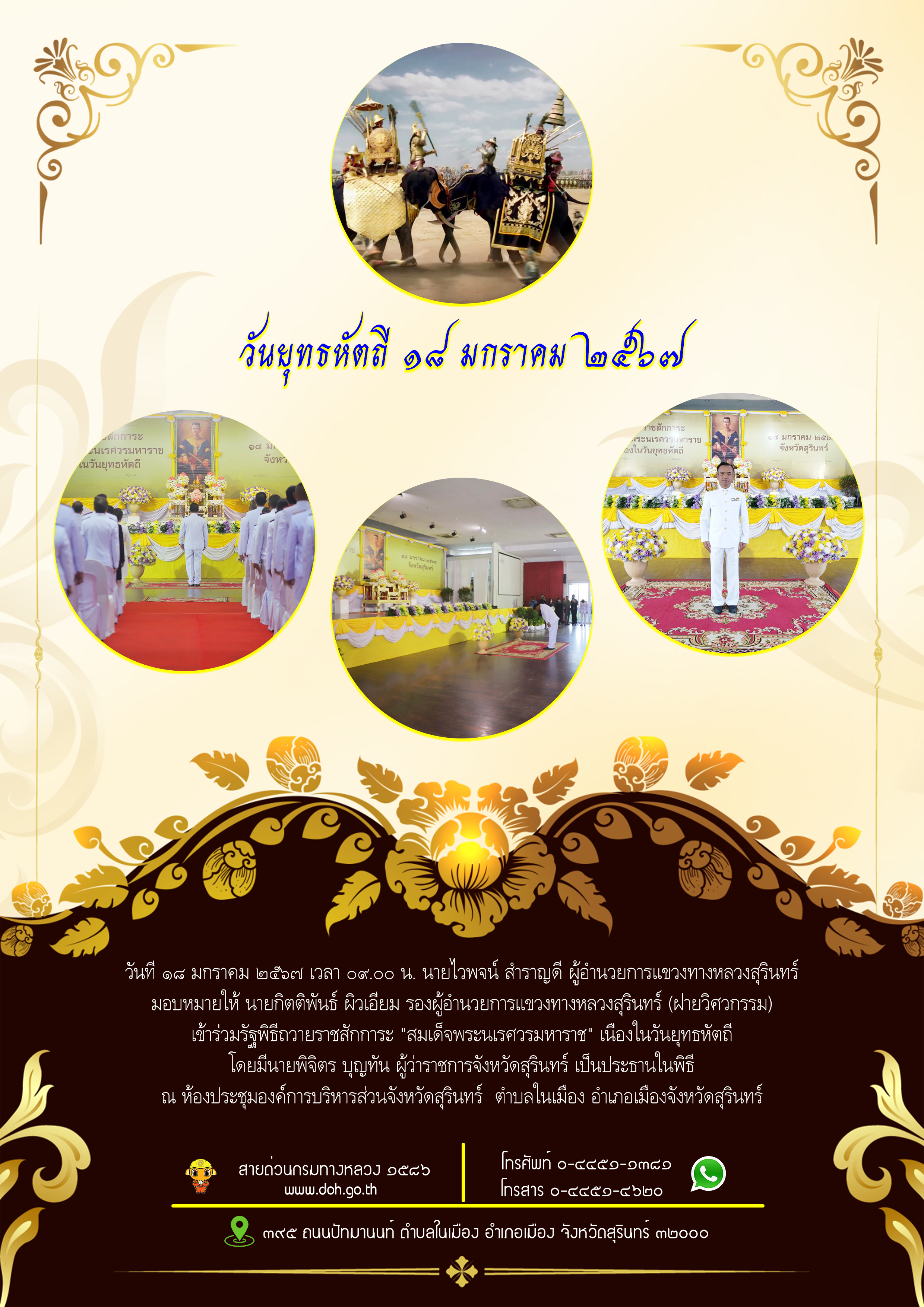 วันที่ ๑๘ มกราคม ๒๕๖๗ เวลา ๐๙.๐๐ น. นายไวพจน์ สำราญดี ผู้อำนวยการแขวงทางหลวงสุรินทร์