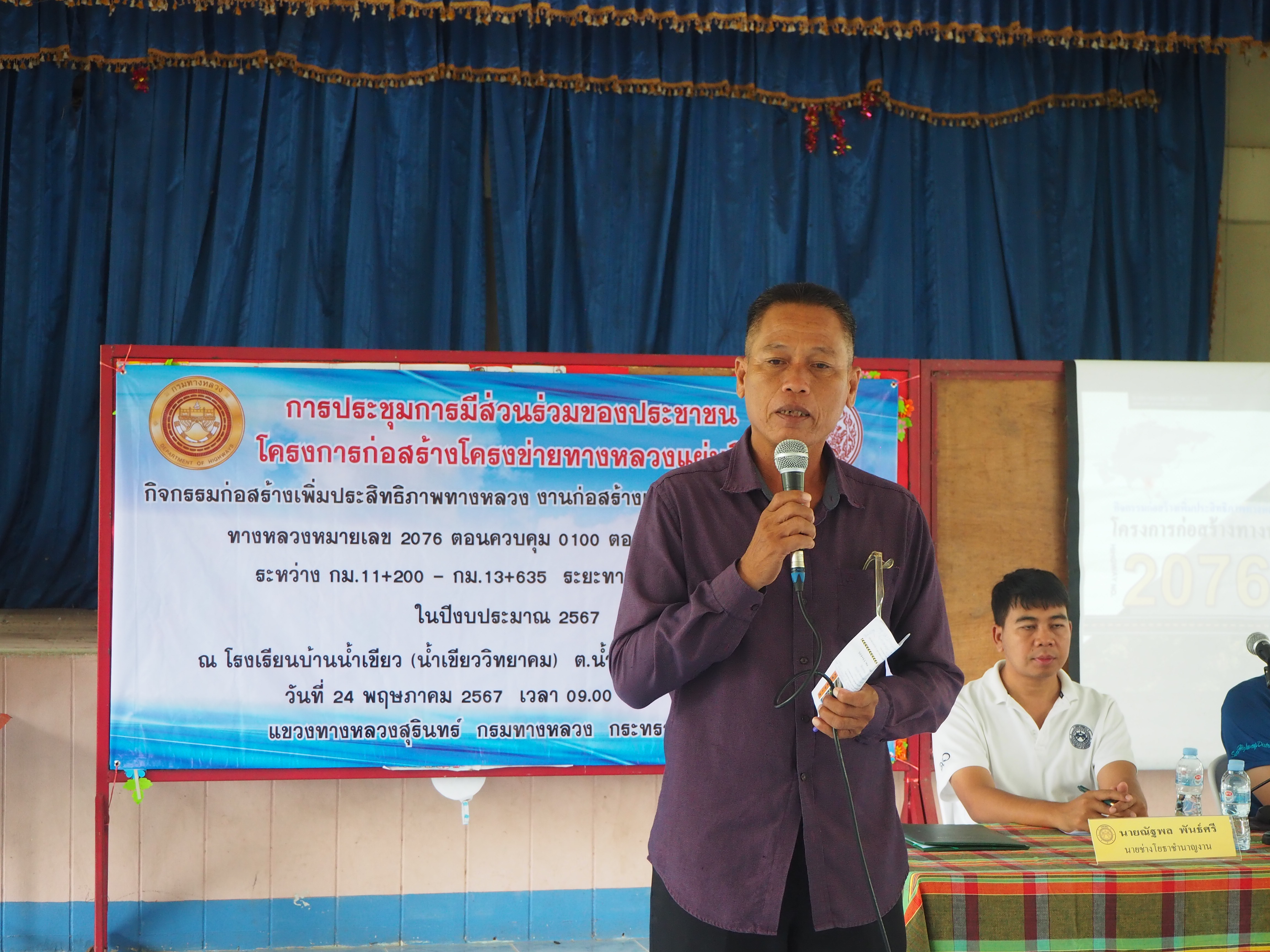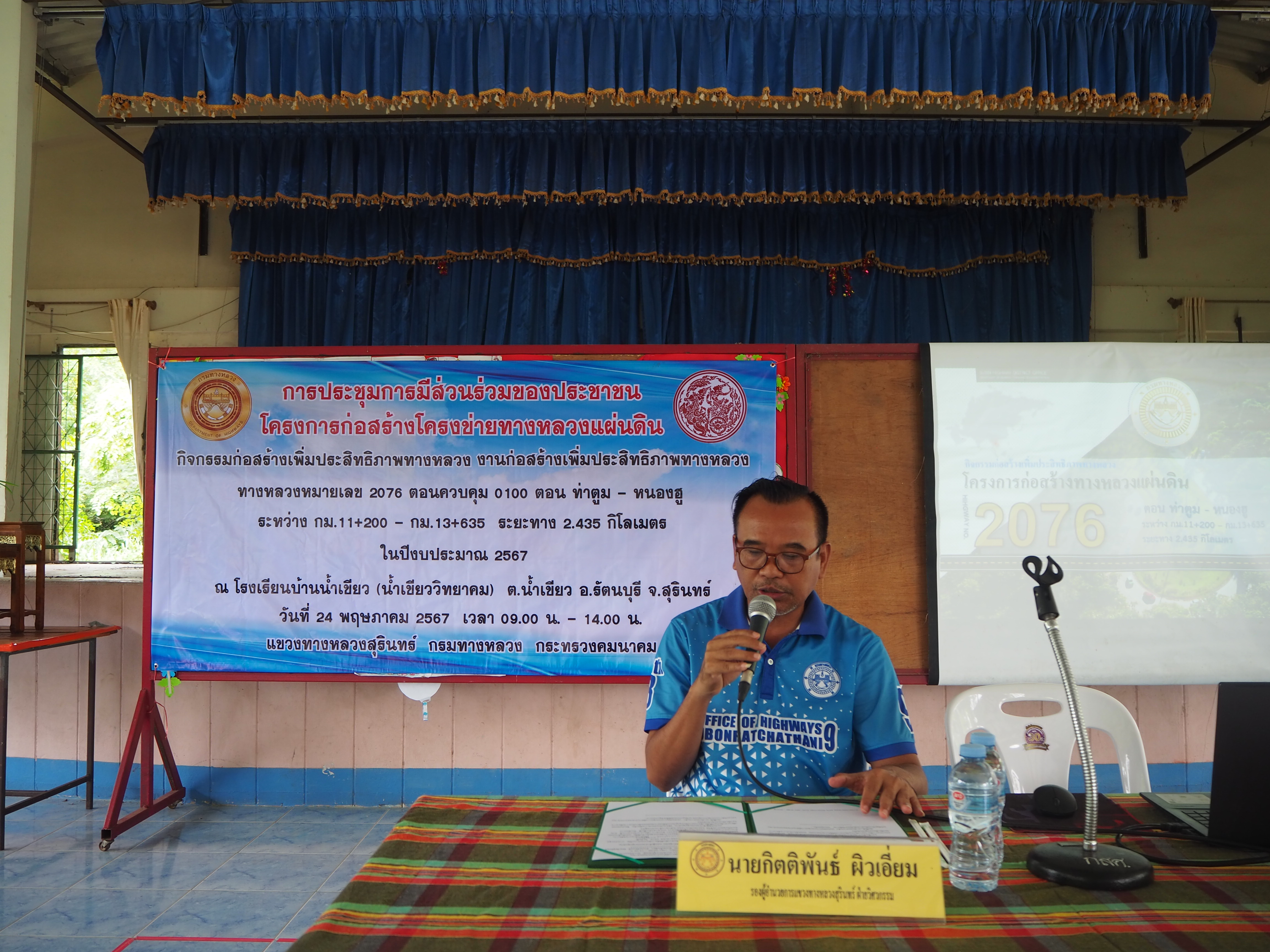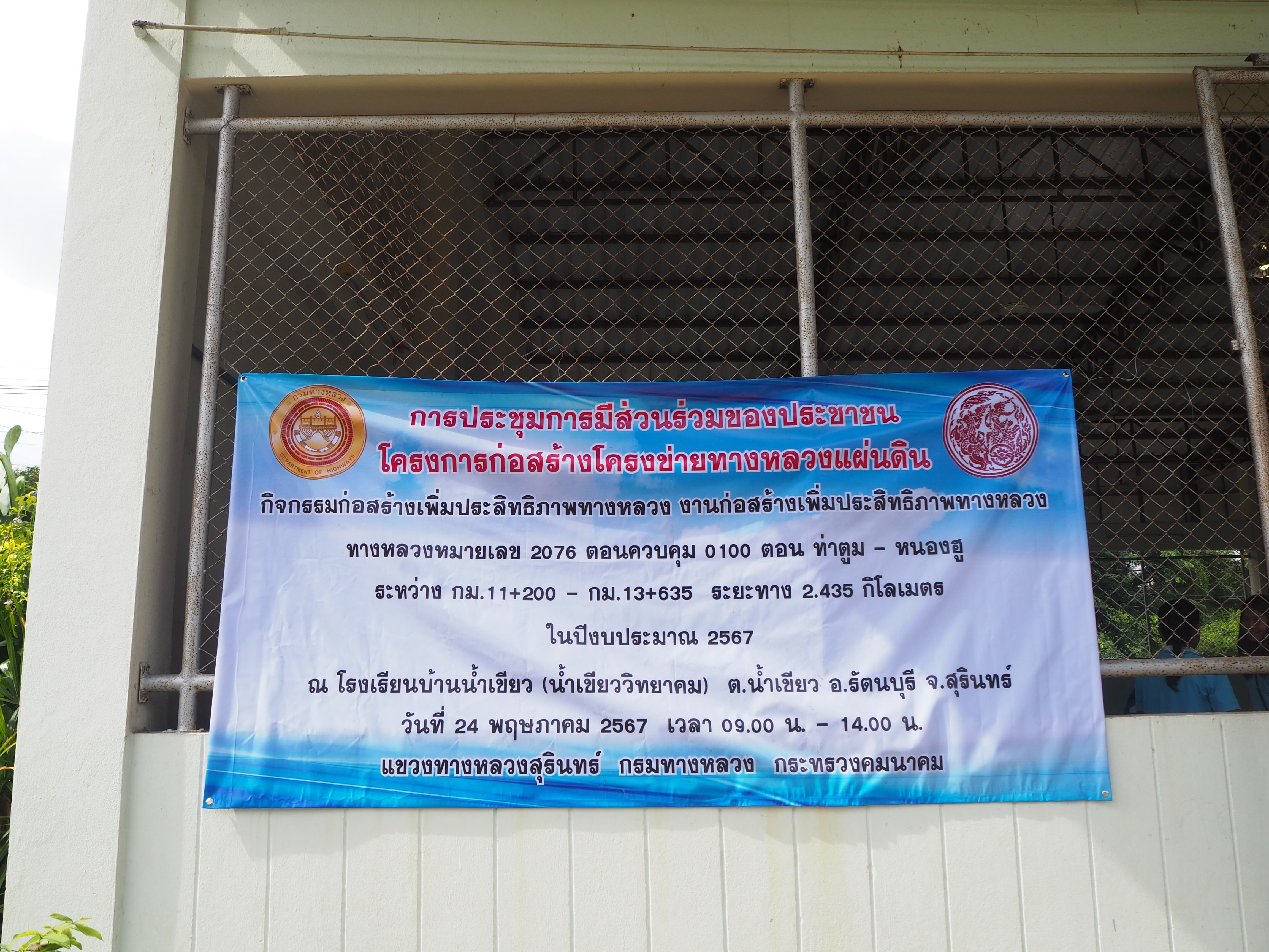 แขวงทางหลวงสุรินทร์ ได้ดำเนินการจัดการมีส่วนร่วมของประชาชน ปีงบประมาณ 2567 โครงการก่อสร้างโครงข่ายทางหลวงแผ่นดิน สำหรับ กิจกรรมยกระดับมาตรฐานและเพิ่มประสิทธิภาพทางหลวง ทางหลวงหมายเลข 2076 ตอนควบคุม 0100 ตอน ท่าตูม - หนองฮู ระหว่าง กม.11+200 - กม.13+635 ระยะทาง 2.435 กิโลเมตร โดยดำเนินการประชุมในวันพฤหัสบดีที่ 24 พฤษภาคม 2567 เวลา 09.00 น. - 14.00 น. ณ โรงเรียนบ้านน้ำเขียว(น้ำเขียววิทยาคม) ตำบลน้ำเขียว อำเภอรัตนบุรี จังหวัดสุรินทร์ เสร็จเรียบร้อยแล้ว
