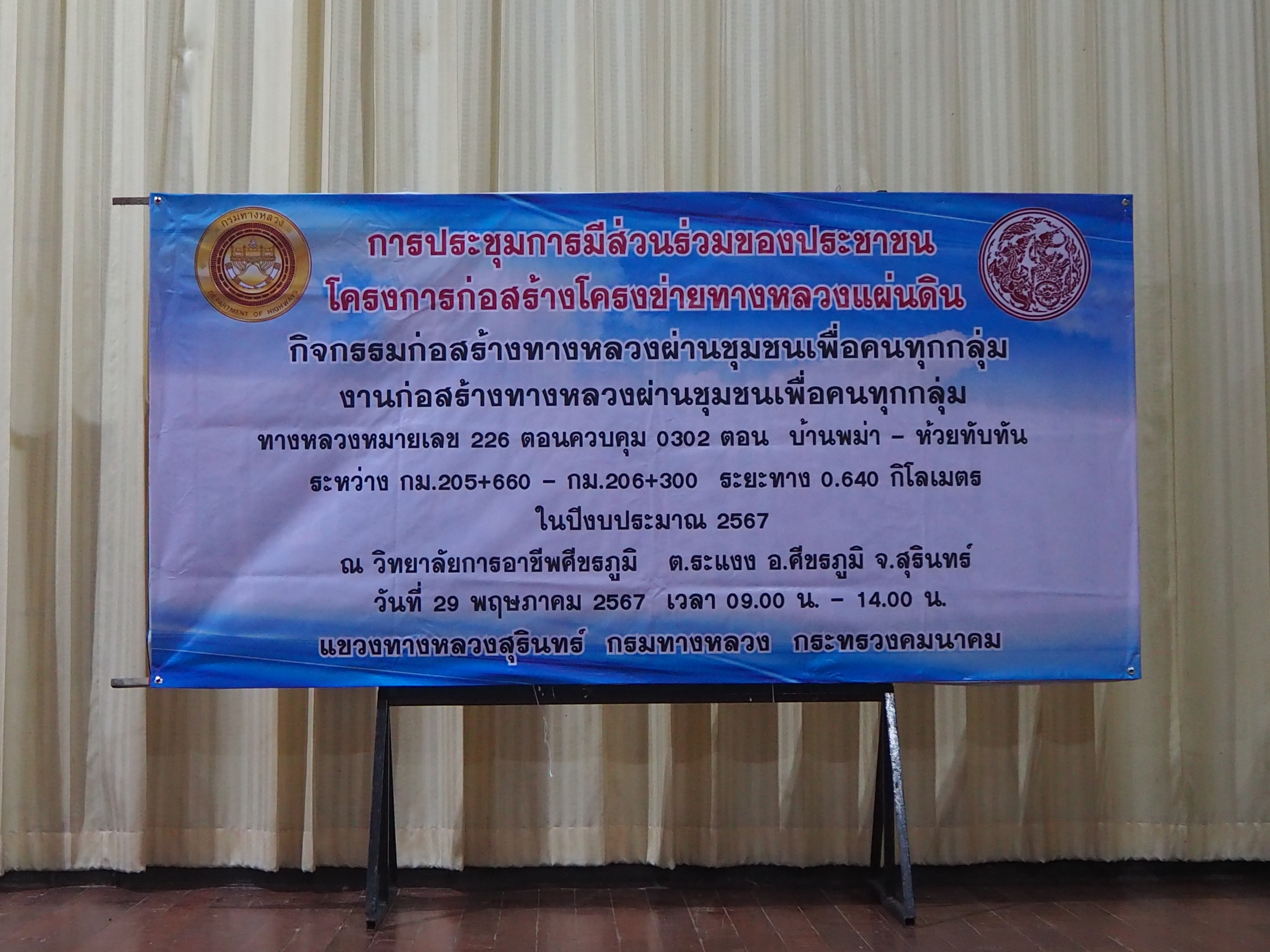 แขวงทางหลวงสุรินทร์ ได้ดำเนินการจัดการมีส่วนร่วมของประชาชน ปีงบประมาณ 2567 โครงการก่อสร้างโครงข่ายทางหลวงแผ่นดิน สำหรับกิจกรรมยกระดับมาตรฐานและเพิ่มประสิทธิภาพทางหลวง ทางหลวงหมายเลข 226 ตอนควบคุม 0302 ตอน บ้านพม่า - ห้วยทับทัน ระหว่าง กม.205+660 - กม.206+300 ระยะทาง 0.640 กิโลเมตร โดยดำเนินการประชุมในวันพุธ ที่ 29 พฤษภาคม 2567 เวลา 09.00 น. - 14.00 น. ณ วิทยาลัยการอาชีพศีขรภูมิ ตำบลระแงง อำเภอศีขรภูมิ จังหวัดสุรินทร์ เสร็จเรียบร้อยแล้ว