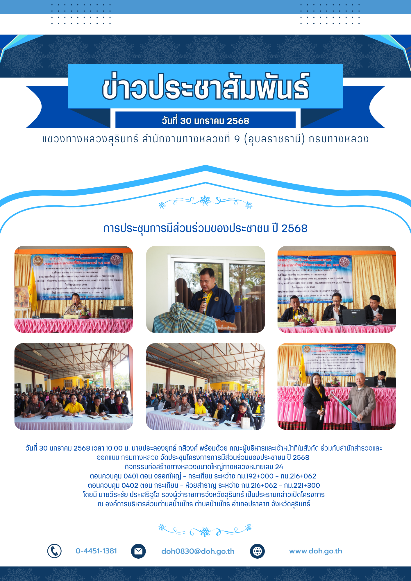 วันที่ 30 มกราคม 2568 เวลา 10.00 น. นายประลองยุทธ์ กสิวงศ์ พร้อมด้วย คณะผู้บริหารและเจ้าหน้าที่ในสังกัด ร่วมกับสำนักสำรวจและออกแบบ กรมทางหลวง จัดประชุมโครงการการมีส่วนร่วมของประชาชน ปี 2568