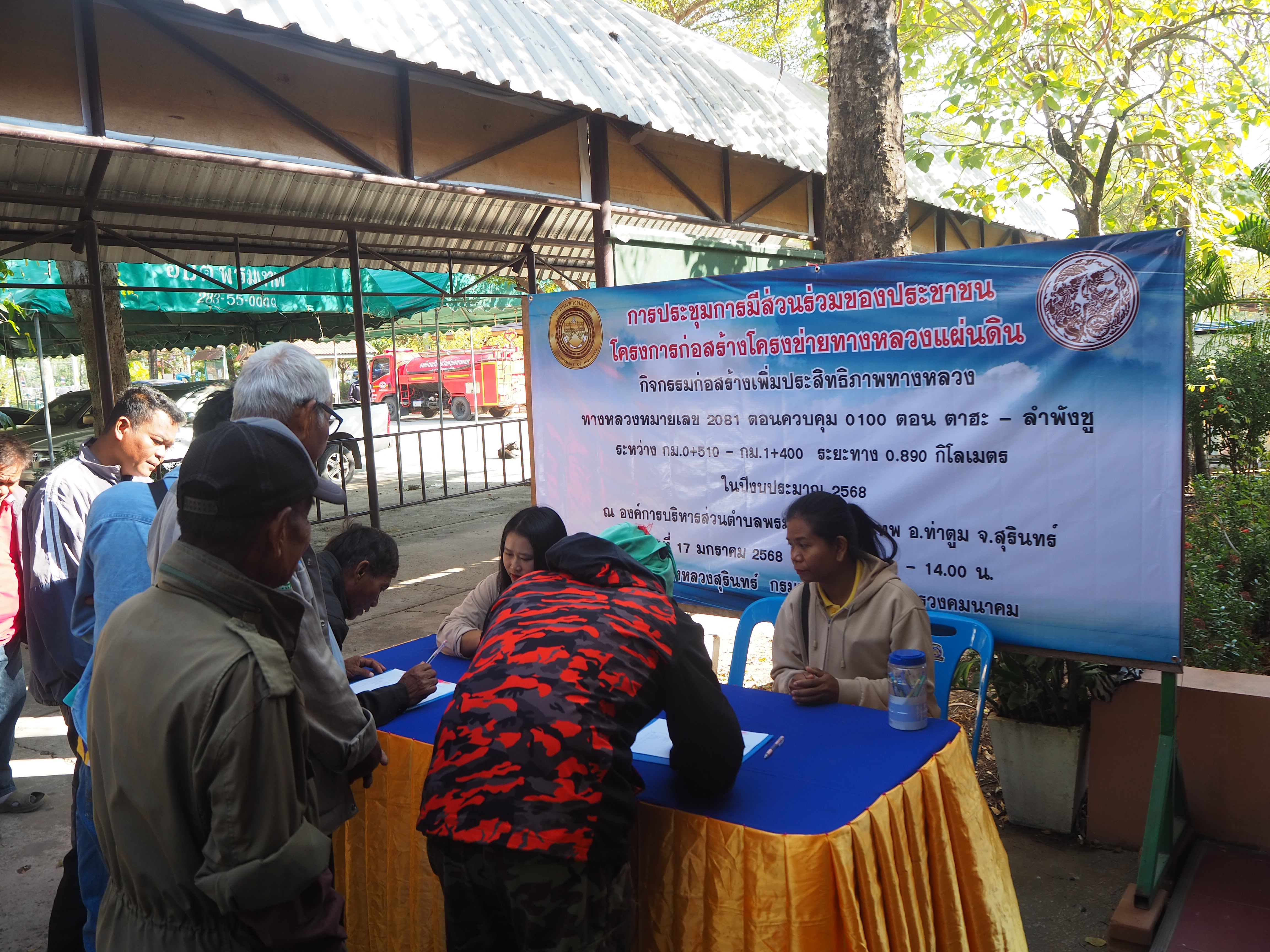 ด้วยแขวงทางหลวงสุรินทร์ จะดำเนินการก่อสร้างทางหลวงหมายเลข 2081 ตอนควบคุม 0100 ตอน ตาฮะ - ลำพังชู ระหว่าง กม.0+510 - กม.1+400 รวมระยะทาง 0.890 กิโลเมตร งบประมาณ 30,000,000.00 บาท ซึ่งการก่อสร้างอาจมีผลทำให้เกิดการเปลี่ยนแปลงต่อสภาพแวดล้อม สภาพสังคมและเศรษฐกิจในพื้นที่ตามแนวเส้นทางก่อสร้าง กรมทางหลวง ได้ตระหนักถึงความสำคัญของกระบวนการการมีส่วนร่วมของประชาชนผู้มีส่วนได้ส่วนเสีย ซึ่งอาจได้รับความเดือดร้อนหรือได้รับผลกระทบโดยตรง จากการดำเนินงานตามโครงการของกรมทางหลวง เพื่อเปิดโอกาสให้ประชาชนได้รับทราบข้อมูลข่าวสารและได้แสดงความคิดเห็นหรือข้อเสนอแนะต่อการดำเนินโครงการของกรมทางหลวง จึงได้จัดให้มีการประชุมการมีส่วนร่วมของประชาชนขึ้น ในวันศุกร์ ที่ 17 มกราคม 2568 เวลา 09.00 น. – 14.00 น. ณ องค์การบริหารส่วนตำบลพรมเทพ ตำบลพรมเทพ