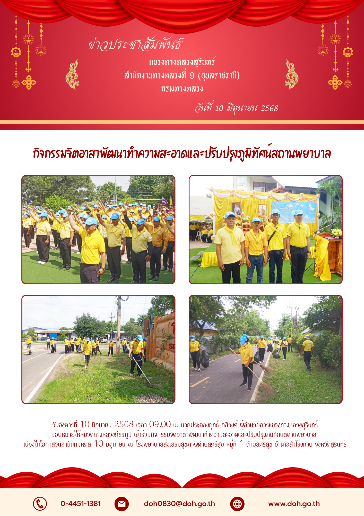 มอบหมายให้หมวดทางหลวงศีขรภูมิ เข้าร่วมกิจกรรมจิตอาสาพัฒนาทำความสะอาดและปรับปรุงภูมิทัศน์สถานพยาบาล
