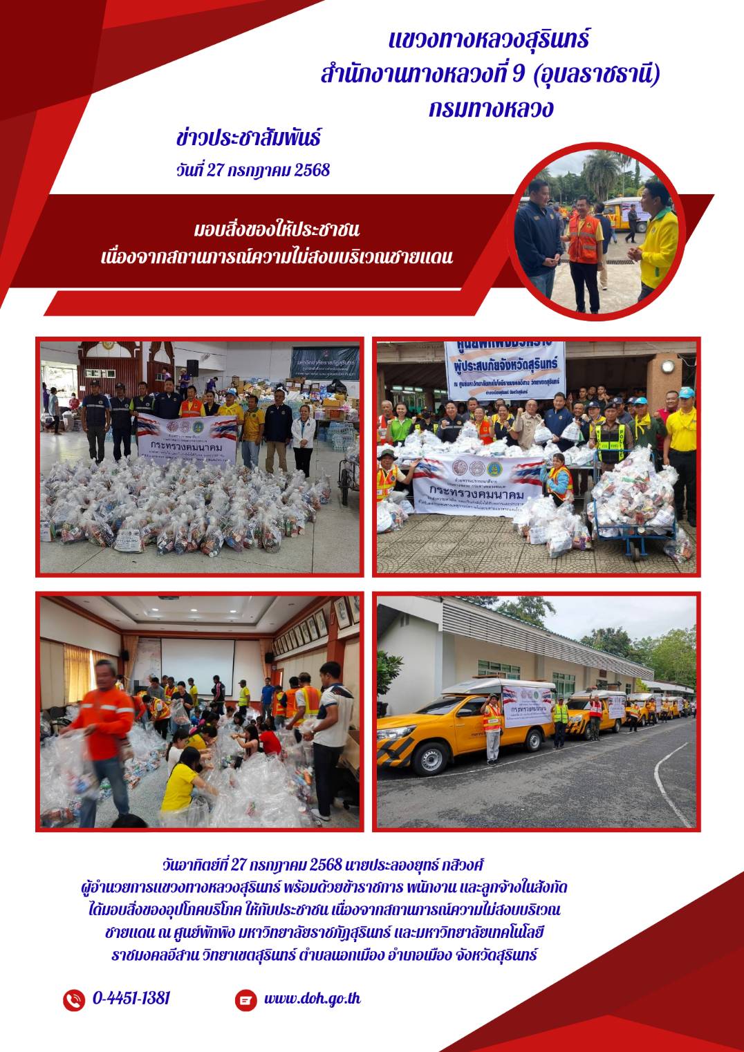 ผู้อำนวยการแขวงทางหลวงสุรินทร์ พร้อมด้วยข้าราชการ พนักงาน และลูกจ้างในสังกัด ได้มอบสิ่งของอุปโภคบริโภค ให้กับประชาชน เนื่องจากสถานการณ์ความไม่สงบบริเวณชายแดน ณ ศูนย์พักพิง มหาวิทยาลัยราชภัฏสุรินทร์ และมหาวิทยาลัยเทคโนโลยี