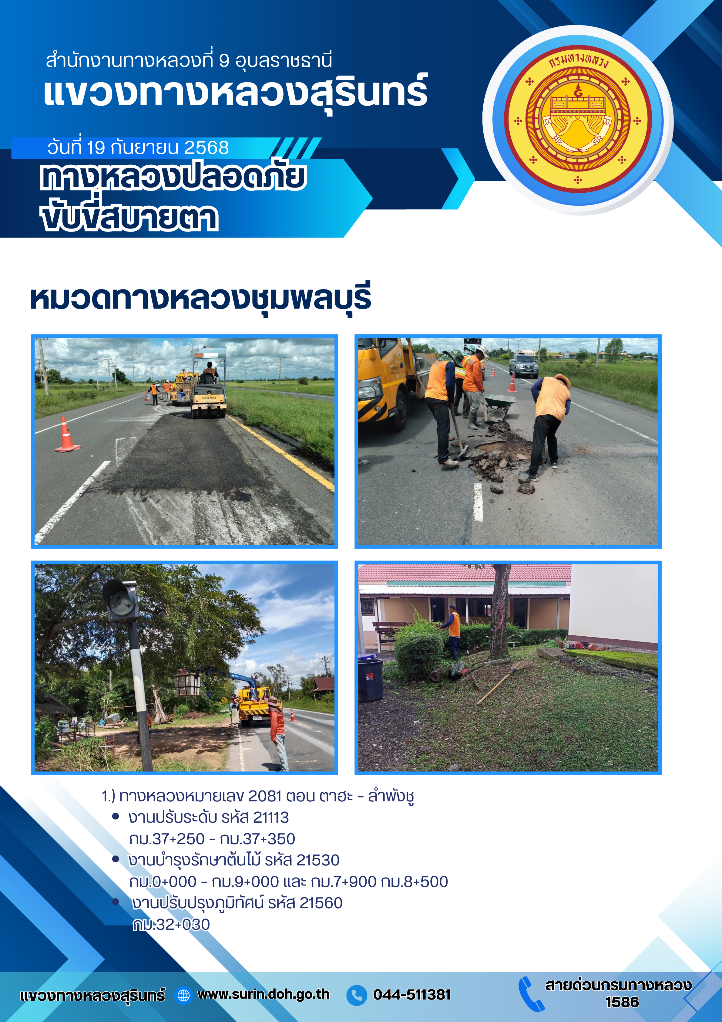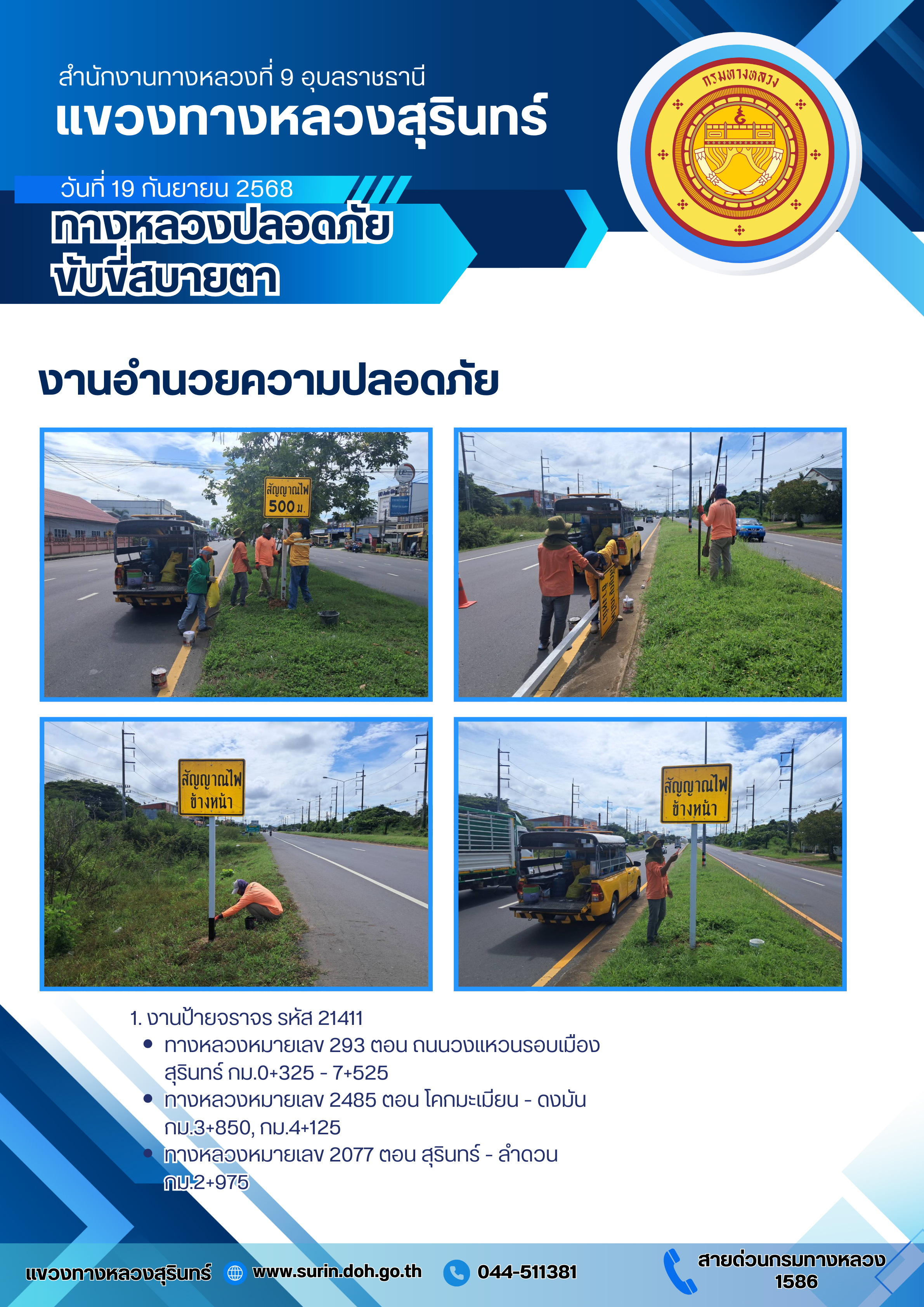 ข้อมูลข่าว : ทางหลวงปลอดภัย ขับขี่สบายตา 19 กันยายน 2568