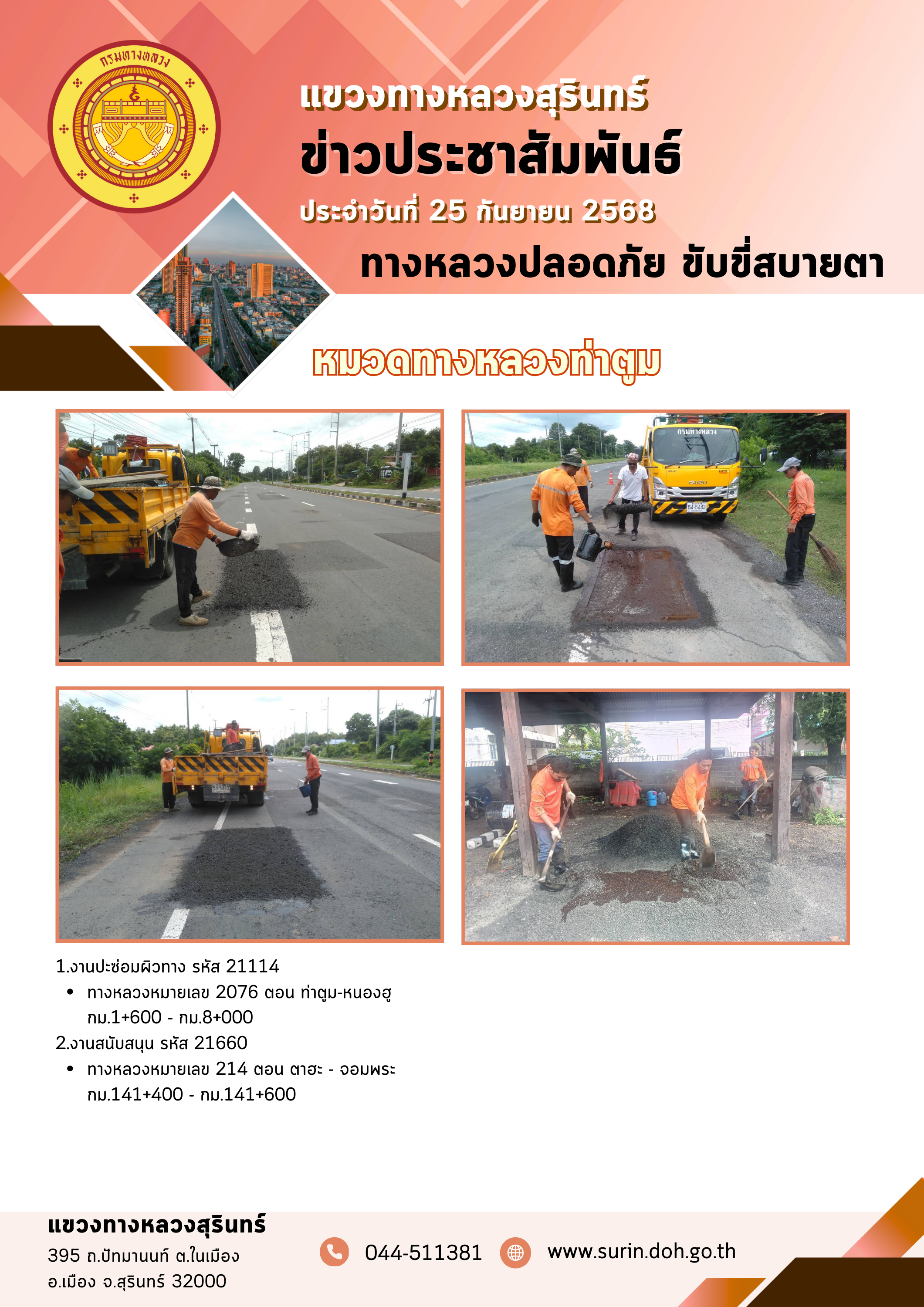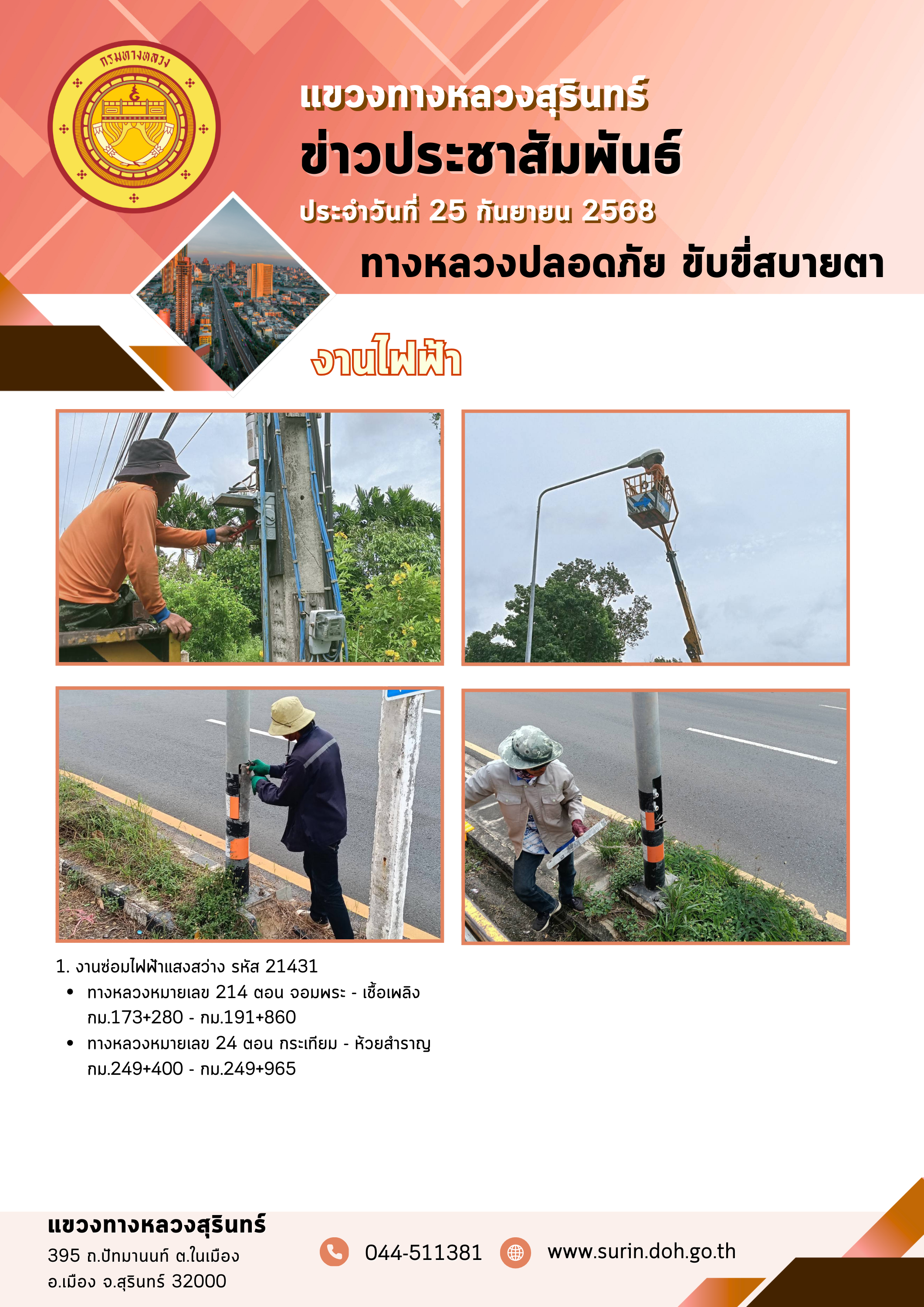 ข้อมูลข่าว : ทางหลวงปลอดภัย ขับขี่สบายตา 25 กันยายน 2568