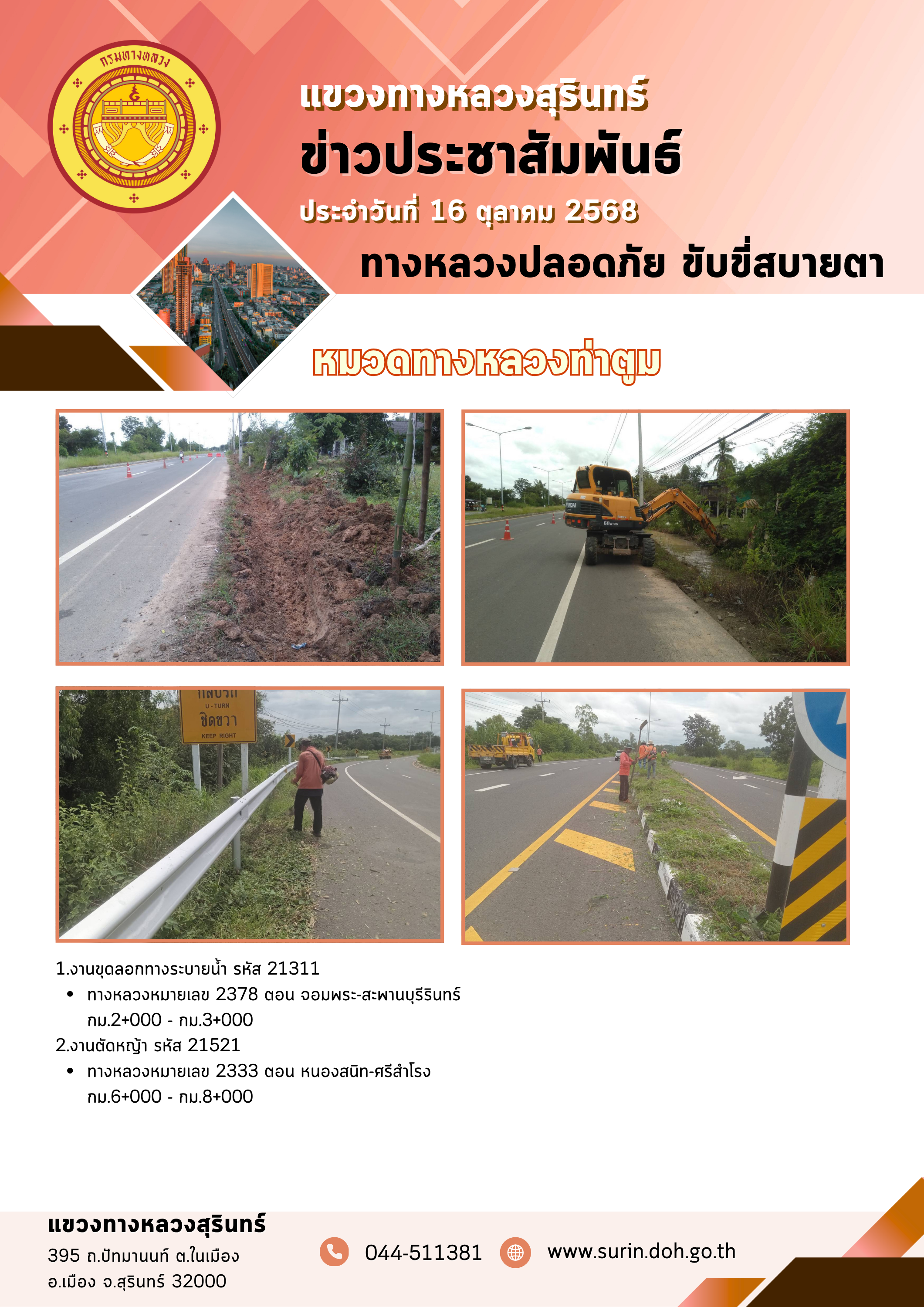 ข้อมูลข่าว : ทางหลวงปลอดภัย ขับขี่สบายตา 16 ตุลาคม 2568