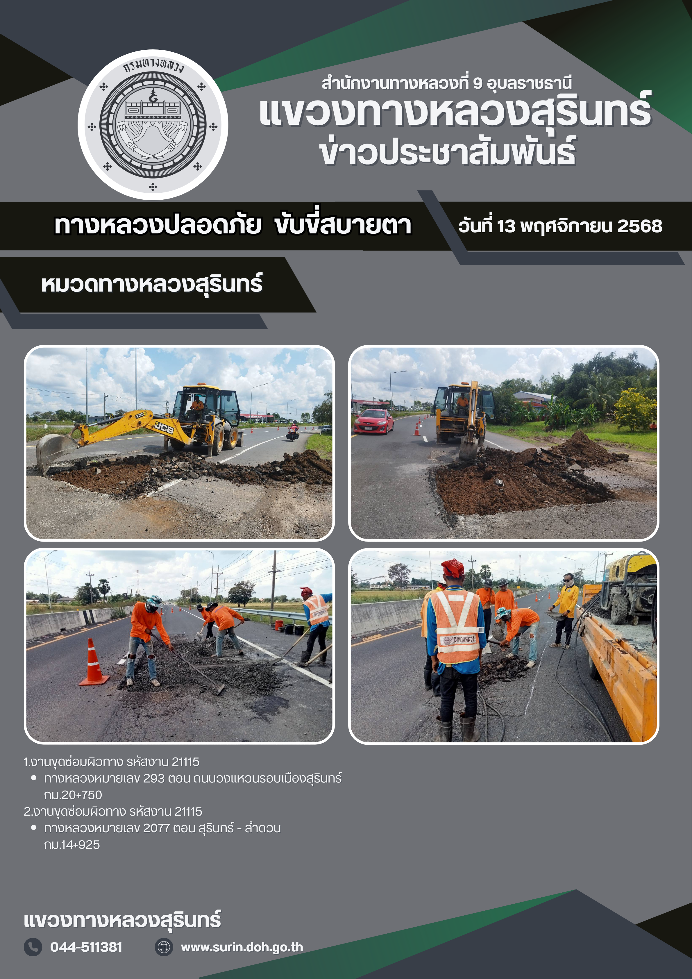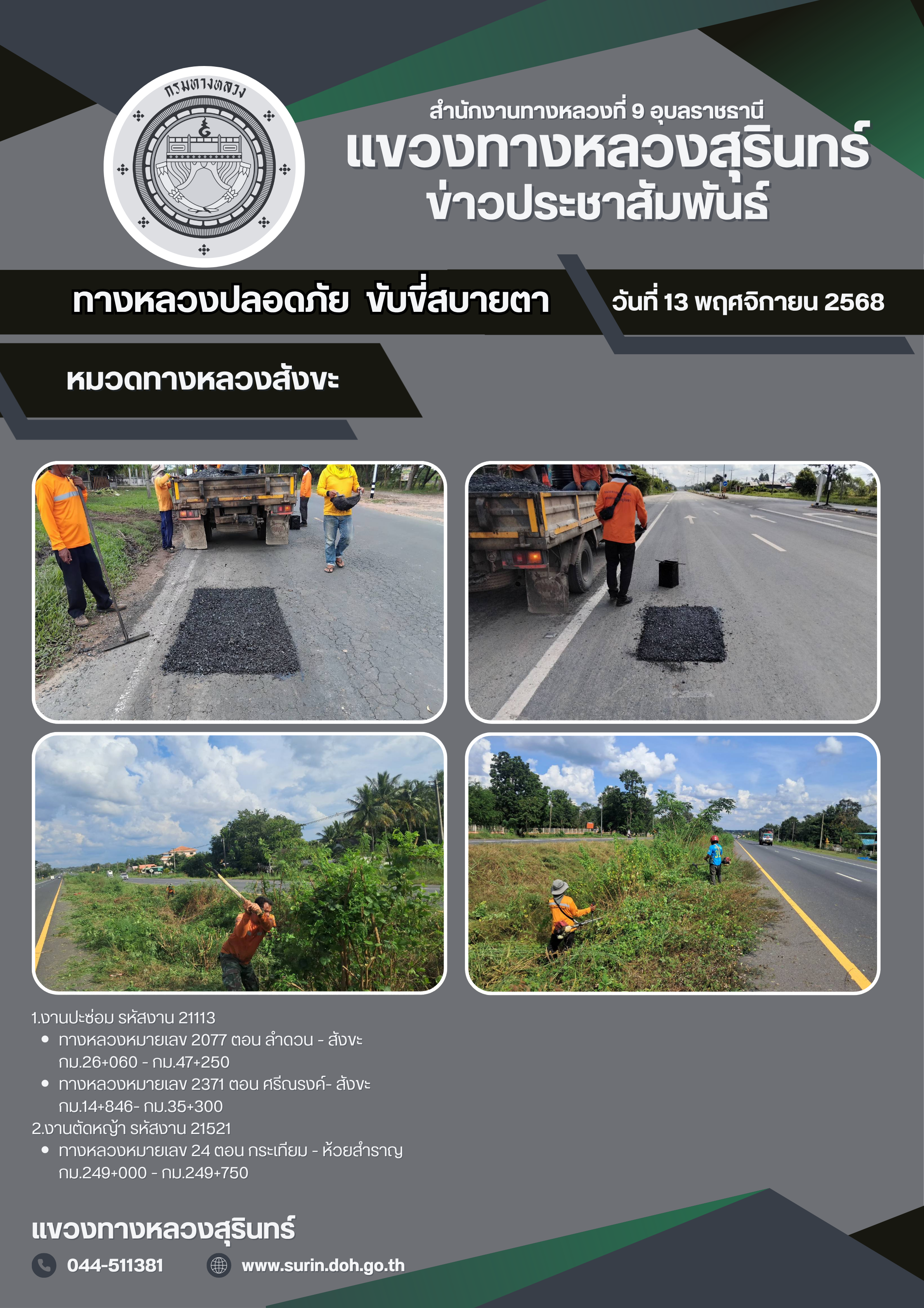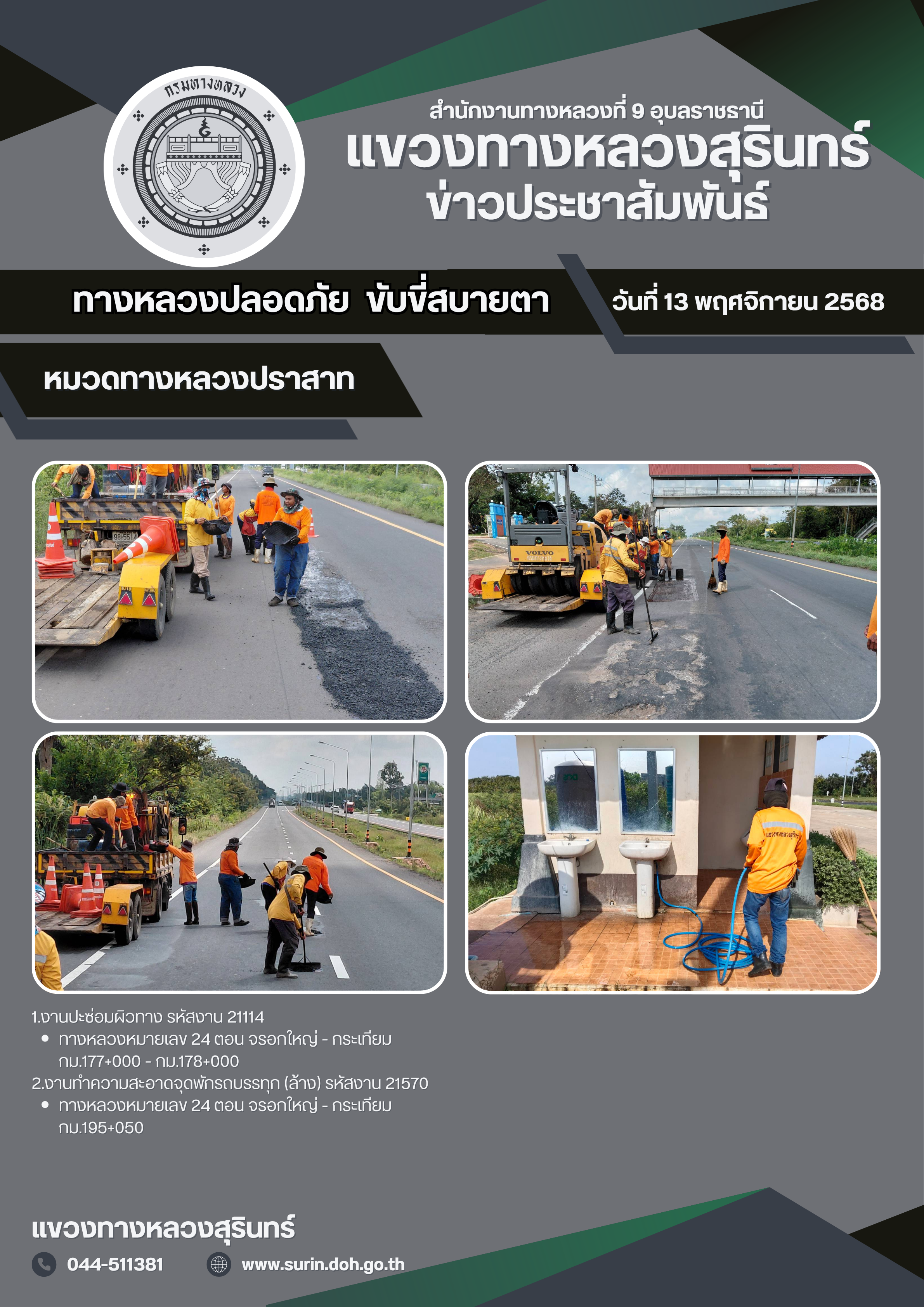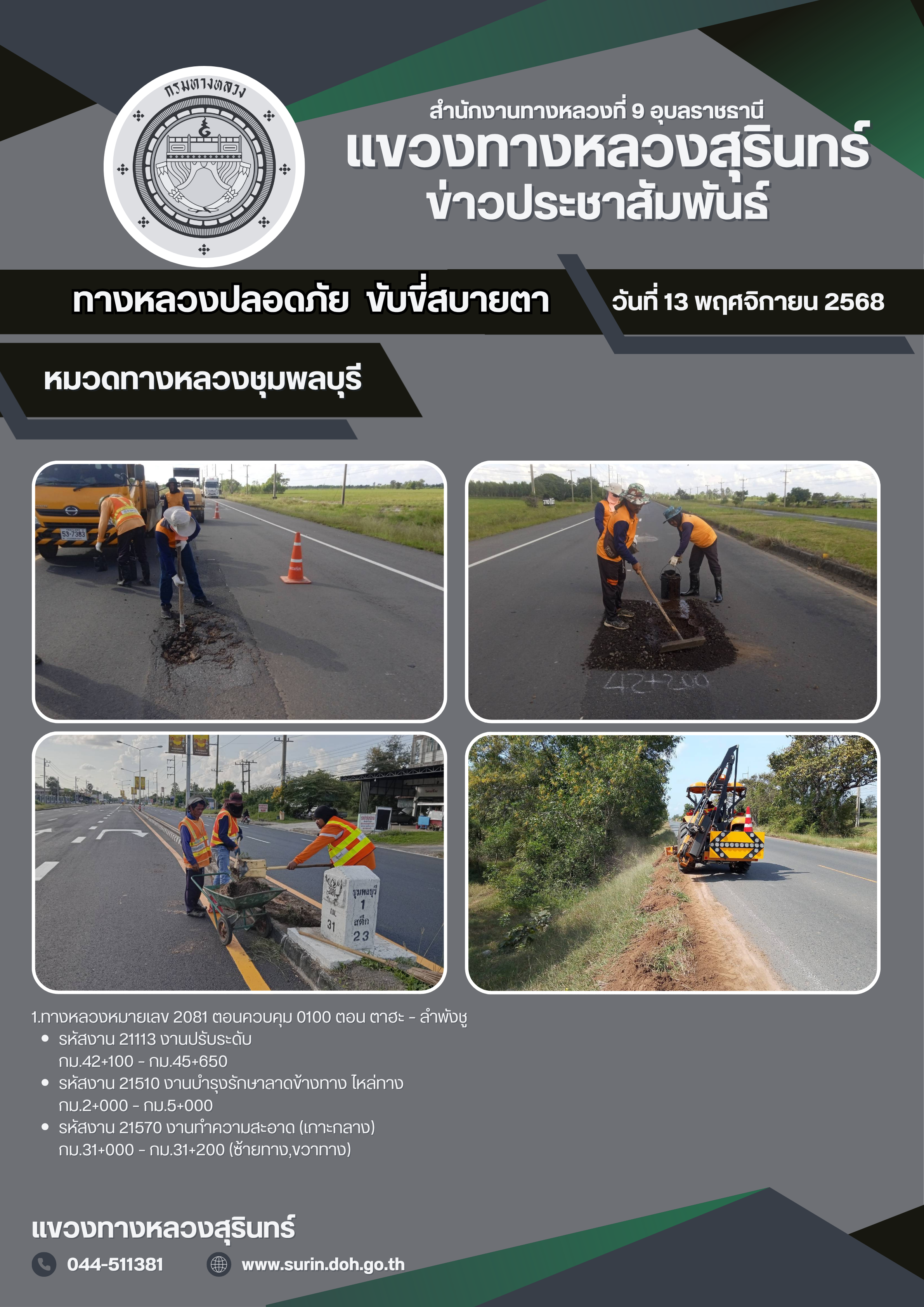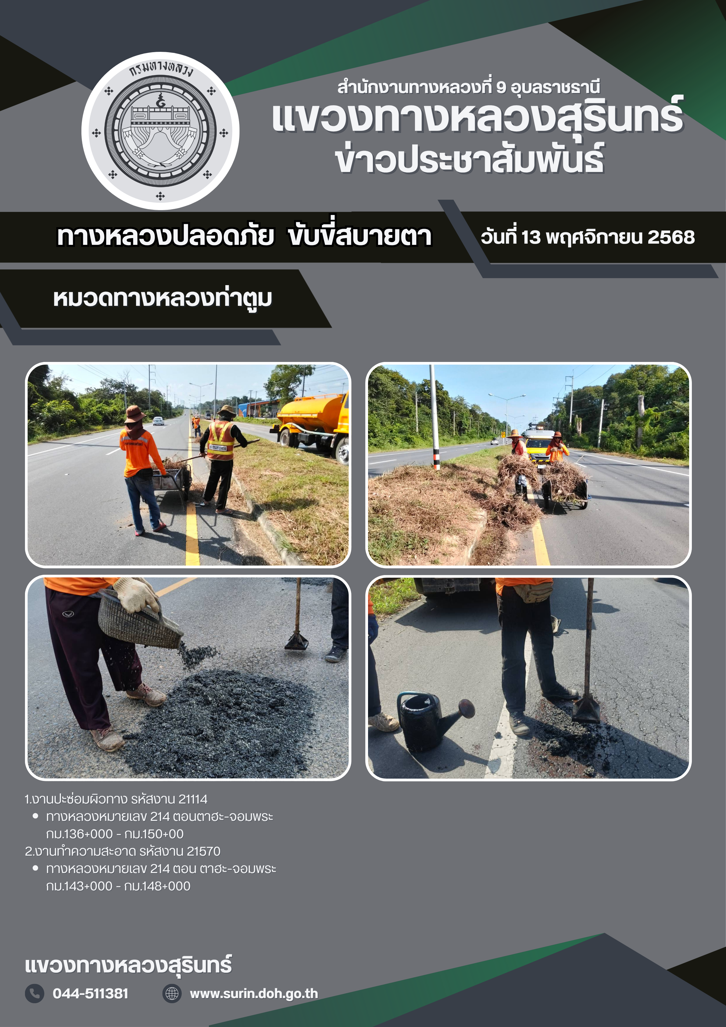 ข้อมูลข่าว : ทางหลวงปลอดภัย ขับขี่สบายตา 13 พฤศจิกายน 2568