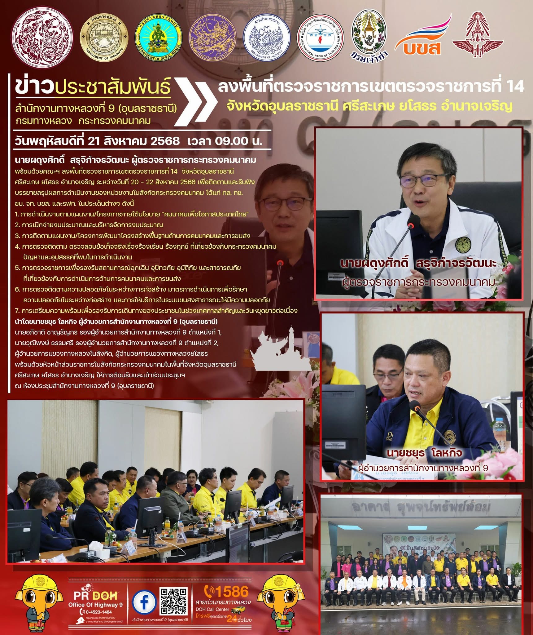 ผู้ตรวจราชการกระทรวงคมนาคม พร้อมด้วยคณะฯ ลงพื้นที่ตรวจราชการเขตตรวจราชการที่ 14 จังหวัดอุบลราชธานี ศรีสะเกษ ยโสธร อำนาจเจริญ