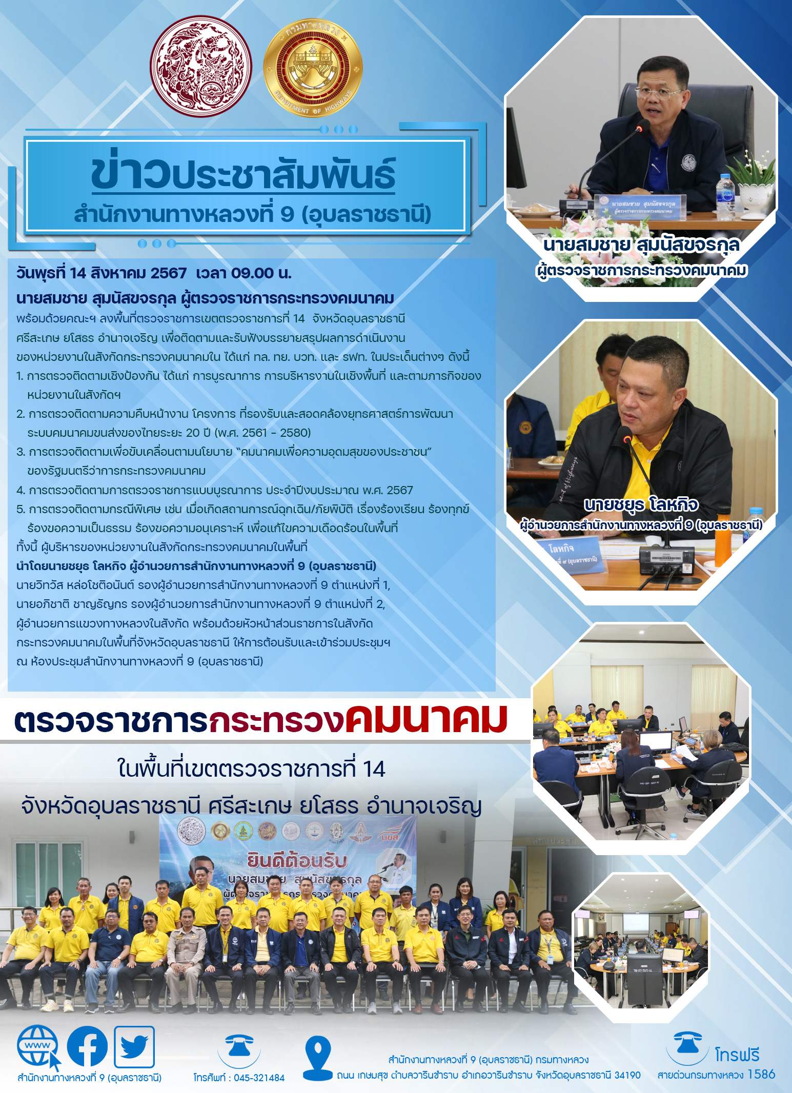 ผู้ตรวจราชการกระทรวงคมนาคม พร้อมด้วยคณะฯ ลงพื้นที่ตรวจราชการเขตตรวจราชการที่ 14 จังหวัดอุบลราชธานี ศรีสะเกษ ยโสธร อำนาจเจริญ