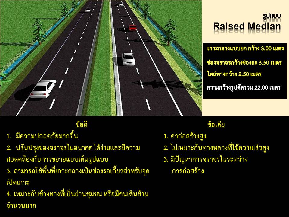 ปรับปรุงขยายผิวจราจรจากเดิม 2 ช่องจราจร เป็น 4 ช่องจราจรเกาะกลางแบบดินถม (Raised Median) ผิวทางแบบ แอสฟัลท์คอนกรีต หนา 0.10 เมตร ความกว้าง 22.00 เมตร รวมไหล่ทาง ตีสีจราจรชนิดเทอร์โมพลาสติก
