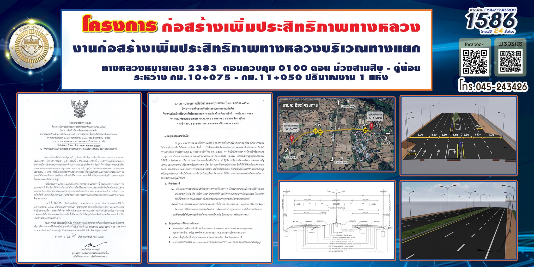 ขอเชิญประชาชนผู้สนใจเข้าร่วมรับฟังและแสดงความคิดเห็น “การประชุมการมีส่วนร่วมของประชาชน ปีงบประมาณ 2567 กิจกรรมก่อสร้างเพิ่มประสิทธิภาพทางหลวง งานก่อสร้างเพิ่มประสิทธิภาพทางหลวงบริเวณทางแยก ทางหลวงหมายเลข 2383 ตอนควบคุม 0100 ตอน ม่วงสามสิบ - ดู่น้อย ระหว่าง กม.10+075 - กม.11+050