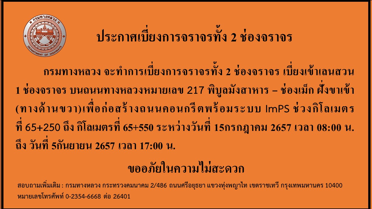 แขวงทางหลวงอุบลราชธานีที่2จะดำเนินการปิดการจราจรบนทางหลวงหมายเลข217 ตอน พิบูลมังสาหาร-ช่องเม็ก ตั้งแต่วันที่ 15 กรกฎาคม 2567-5กันยายน 2567 เพื่อให้ประชาชนผู้ใช้เส้นทางและผู้ที่เกี่ยวข้องได้ทราบ หลีกเลี่ยงการใช้เส้นทางดังกล่าว