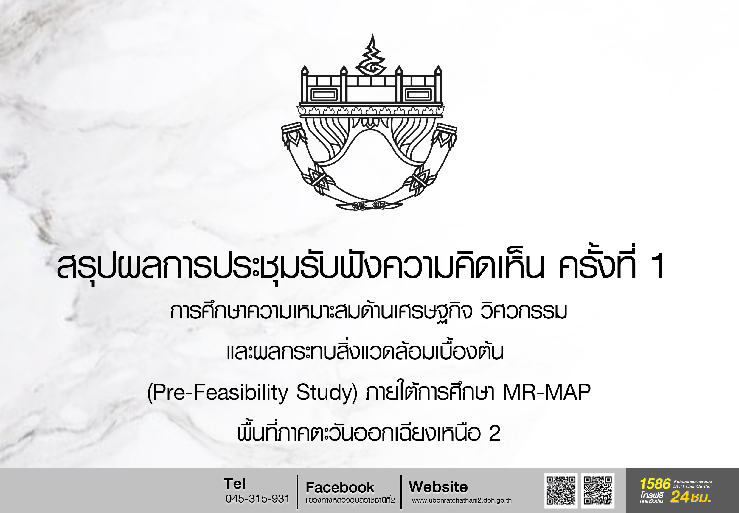 สรุปผลการประชุมรับฟังความคิดเห็น ครั้งที่ 1 การศึกษาความเหมาะสมด้านเศรษฐกิจ วิศวกรรมและผลกระทบสิ่งแวดล้อมเบื้องต้น (Pre-Feasibility Study) ภายใต้การศึกษา MR-MAPพื้นที่ภาคตะวันออกเฉียงเหนือ 2