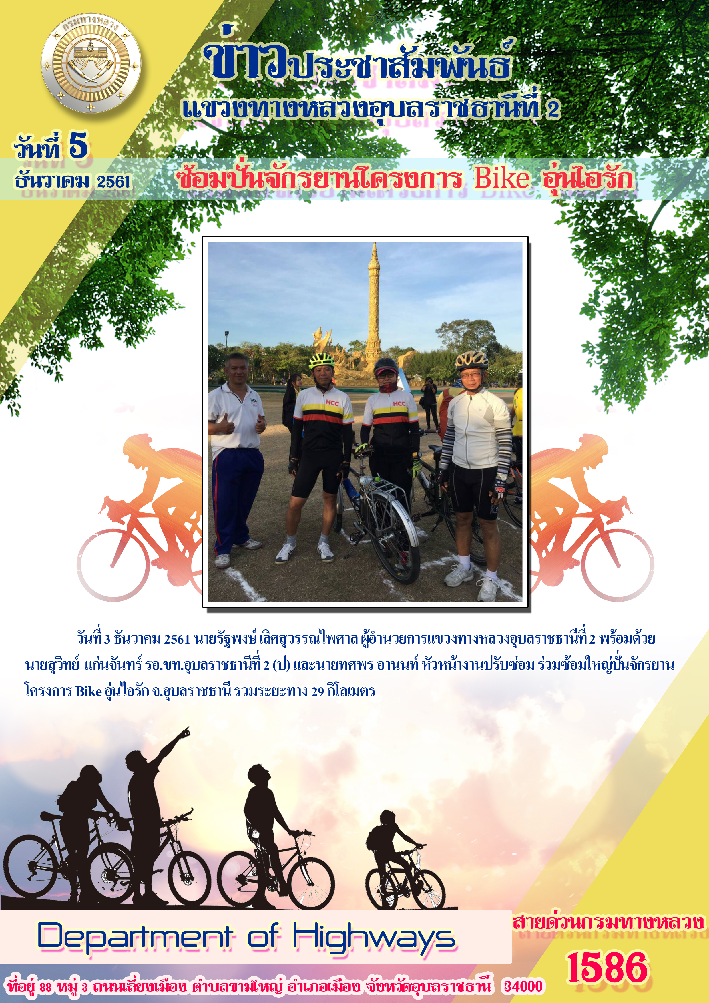 วันที่ 3 ธันวาคม 2561 นายรัฐพงษ์ เลิศสุวรรณไพศาล ผู้อำนวยการแขวงทางหลวงอุบลราชธานีที่ 2 พร้อมด้วย นายสุวิทย์ แก่นจันทร์ รอ.ขท.อุบลราชธานีที่ 2 (ป)และนายทศพร อานนท์ หัวหน้างานปรับซ่อม ร่วมซ้อมใหญ่ปั่นจักรยานโครงการ Bike อุ่นไอรัก จ.อุบลราชธานี รวมระยะทาง 29 กิโลเมตร