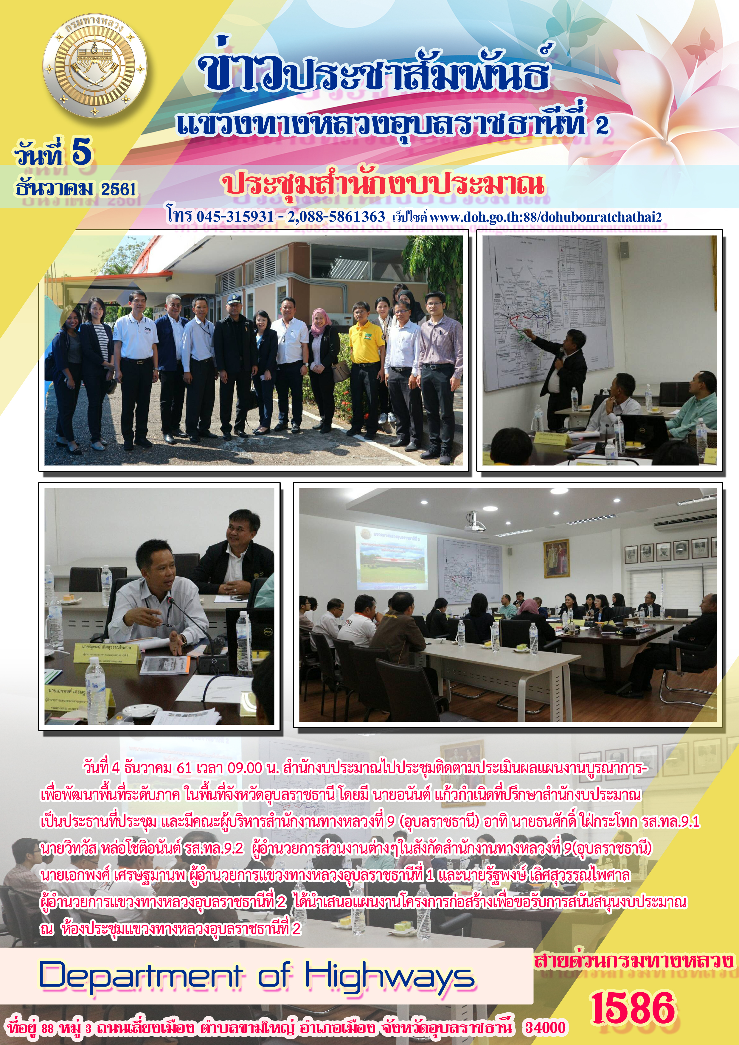 วันที่ 4 ธันวาคม 2561 เวลา 09.00 น. สำนักงบประมาณไปประชุมติดตามประเมินผลแผนงานบูรณาการเพื่อพัฒนาพื้นที่ระดับภาค ในพื้นที่จังหวัดอุบลราชธานี โดยมี นายอนันต์ แก้วกำเนิดที่ปรึกษาสำนักงบประมาณเป็นประธานที่ประชุม และมีคณะผู้บริหารสำนักงานทางหลวงที่ 9 (อุบลราชธานี) อาทิ นายธนศักดิ์ ใฝ่กระโทก รส.ทล.9.1 นายวิทวัส หล่อโชติอนันต์ รส.ทล.9.2 ผู้อำนวยการส่วนงานต่างๆในนสังกัดสำนักงานทางหลวงที่ 9 (อุบลราชธานี) นายเอกพงศ์ เศรษฐมานพ ผู้อำนวยการแขวงทางหลวงอุบลราชธานีที่ 1 และนายรัฐพงษ์ เลิศสุวรรณไพศาล ผู้อำนวยการแขวงทางหลวงอุบลราชธานีที่ 2 ได้นำเสนอแผนงานโครงการก่อสร้างเพื่อขอรับการสนับสนุนงบประมาณ ณ ห้องประชุมแขวงทางหลวงอุบลราชธานีที่ 2