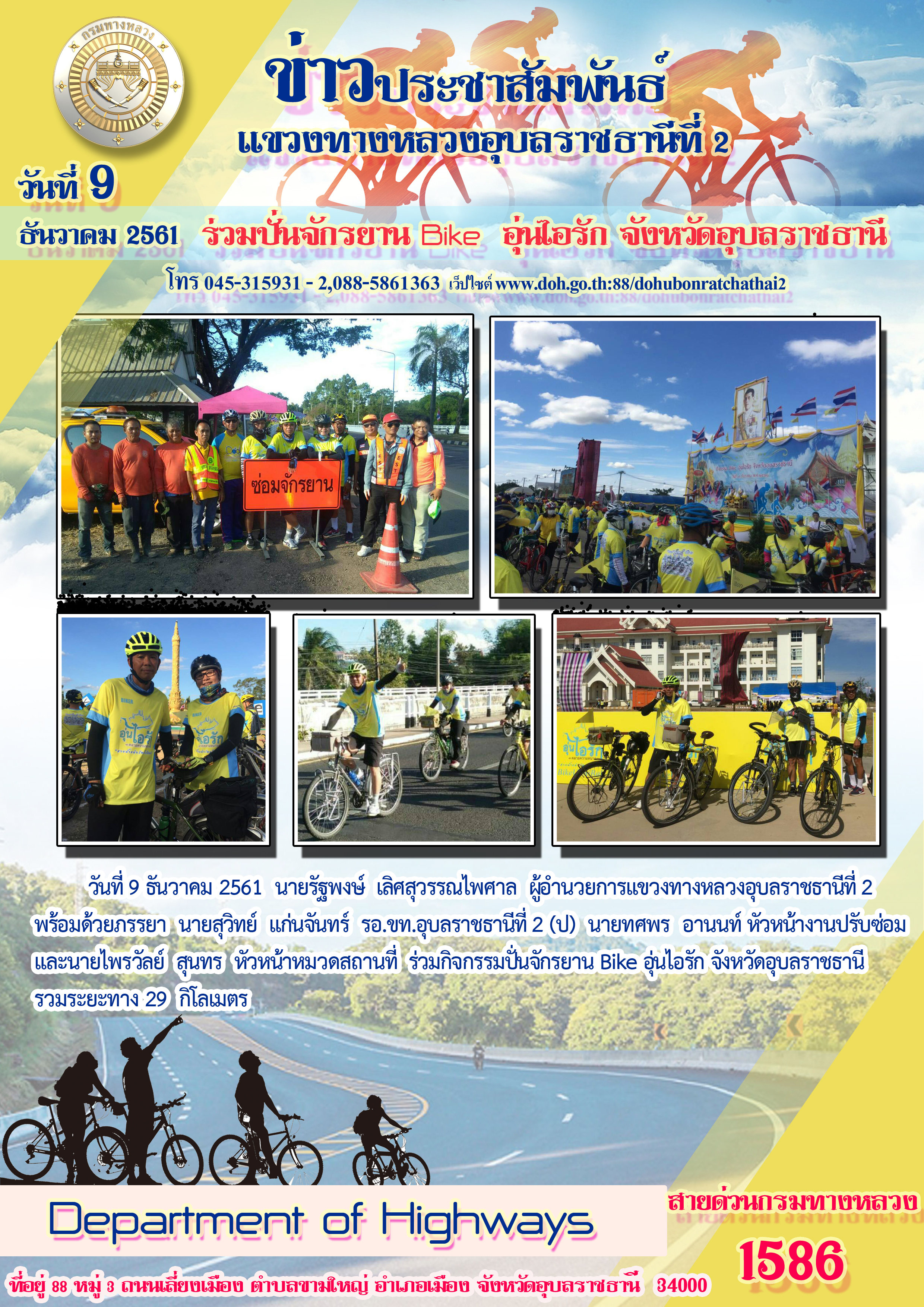 วันที่ 9 ธันวาคม 2561 นายรัฐพงษ์ เลิศสุวรรณไพศาล ผู้อำนวยการแขวงทางหลวงอุบลราชธานีที่ 2 พร้อมด้วยภรรยา นายสุวิทย์ แก่นจันทร์ รอ.ขท.อุบลราชธานีที่ 2 (ป) นายทศพร อานนท์ หัวหน้างานปรับซ่อม และนายไพรวัลย์ สุนทร หัวหน้าหมวดสถานที่ ร่วมกิจกรรมปั่นจักรยาน Bike อุ่นไอรัก จังหวัดอุบลราชธานี รวมระยะทาง 29 กิโลเมตร