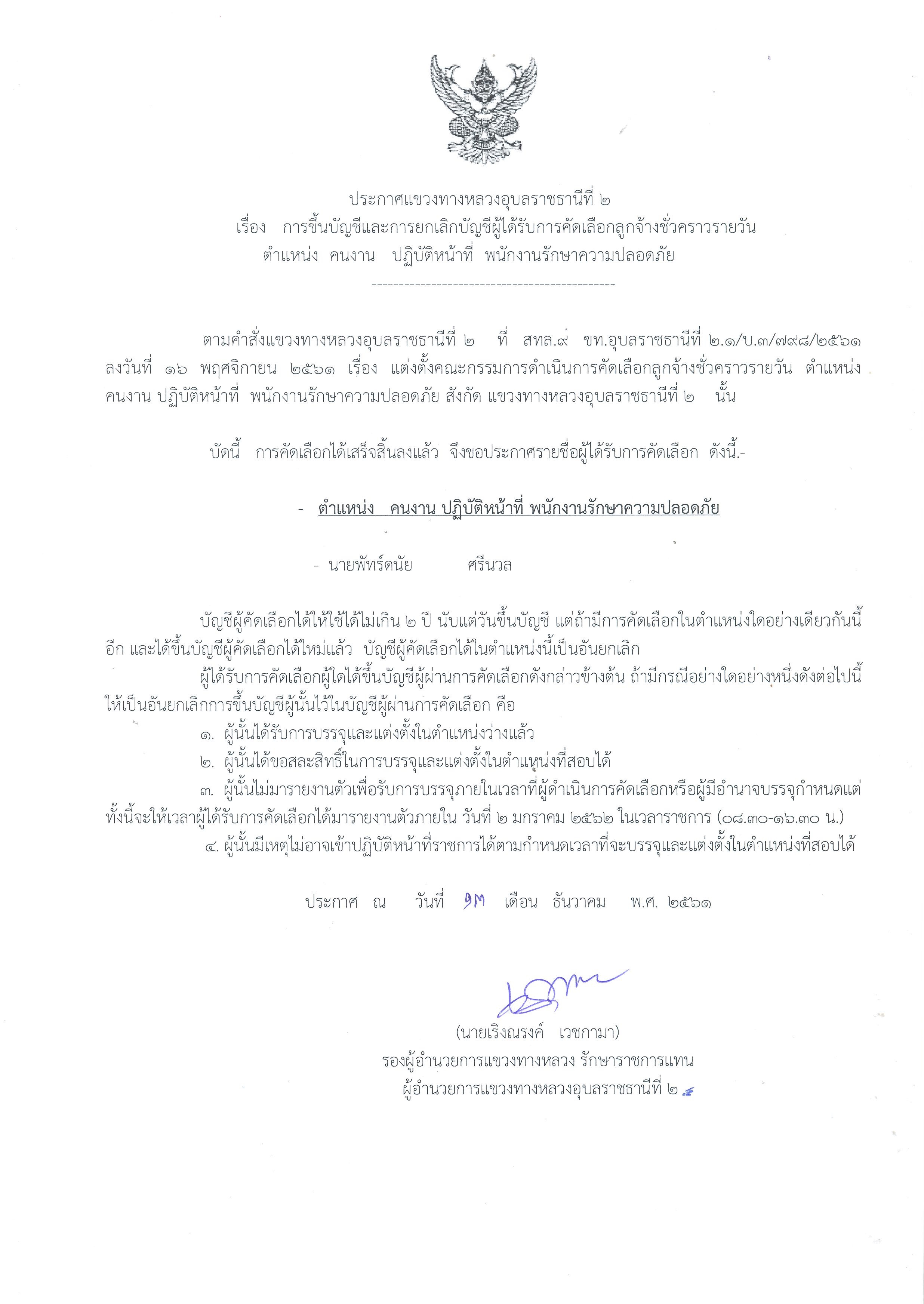 ตามคำสั่งแขวงทางหลวงอุบลราชธานีที่ 2 ที่ สทล.9 ขท.อุบลราชธานีที่ 2.3/บ.3/797/2561 ลงวันที่ 16 พฤศจิกายน 2561 เรื่อง แต่งตั้งคณะกรรมการดำเนินการสอบคัดเลือกลูกจ้างชั่วคราวรายวัน ตำแหน่ง คงงาน ปฏิบัติหน้าที่ เจ้าหน้าที่ธุรการ สังกัด แขวงทางหลวงอุบลราชธานีที่ 2 นั่น