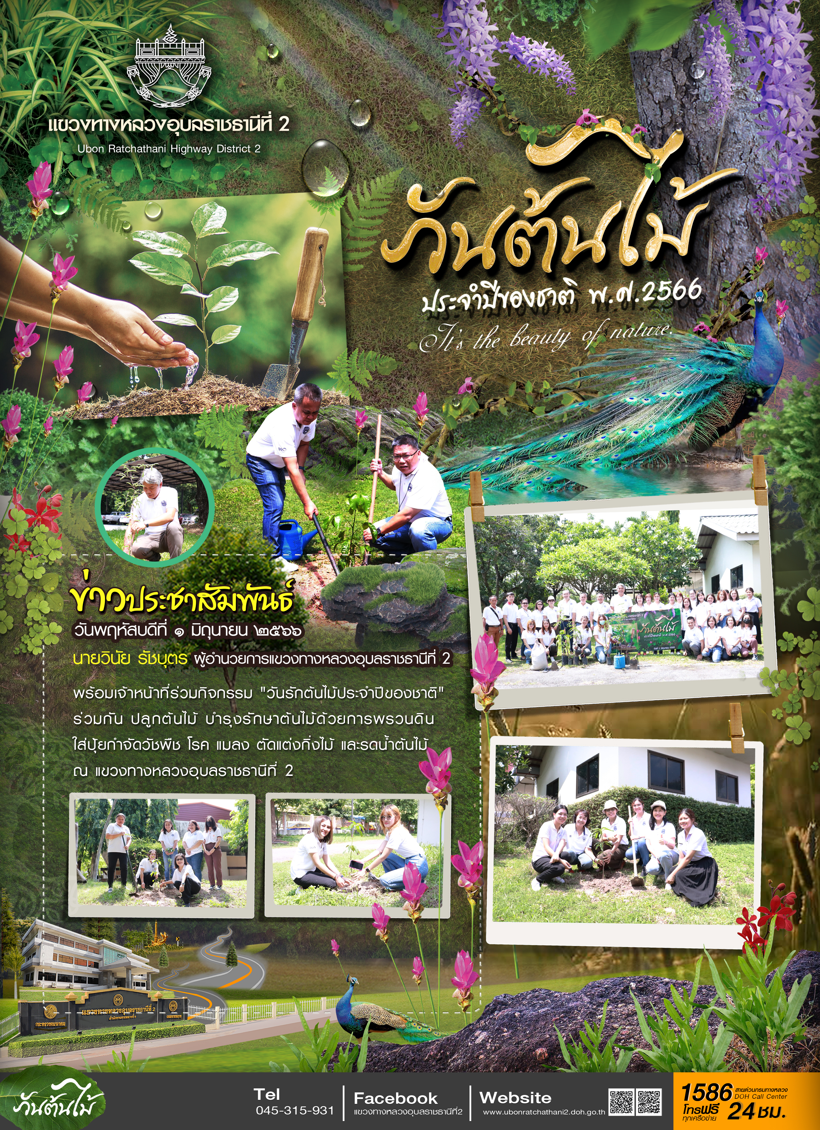 ข่าวประชาสัมพันธ์วันต้นไม้แห่งชาตินายวินัย รัชบุตร พร้อมเจ้าหน้าที่ร่วมกิจกรรม "วันรักต้นไม้ประจำปีของชาติ" ร่วมกัน ปลูกต้นไม้ บำรุงรักษาต้นไม้ด้วยการพรวนดิน ใส่ปุ้ยกำจัดวัชพืช โรค แมลง ตัดแต่งกิ่งไม้ และรดน้ำต้นไม้ ณ แขวงทางหลวงอุบลราชธานีที่ 2
