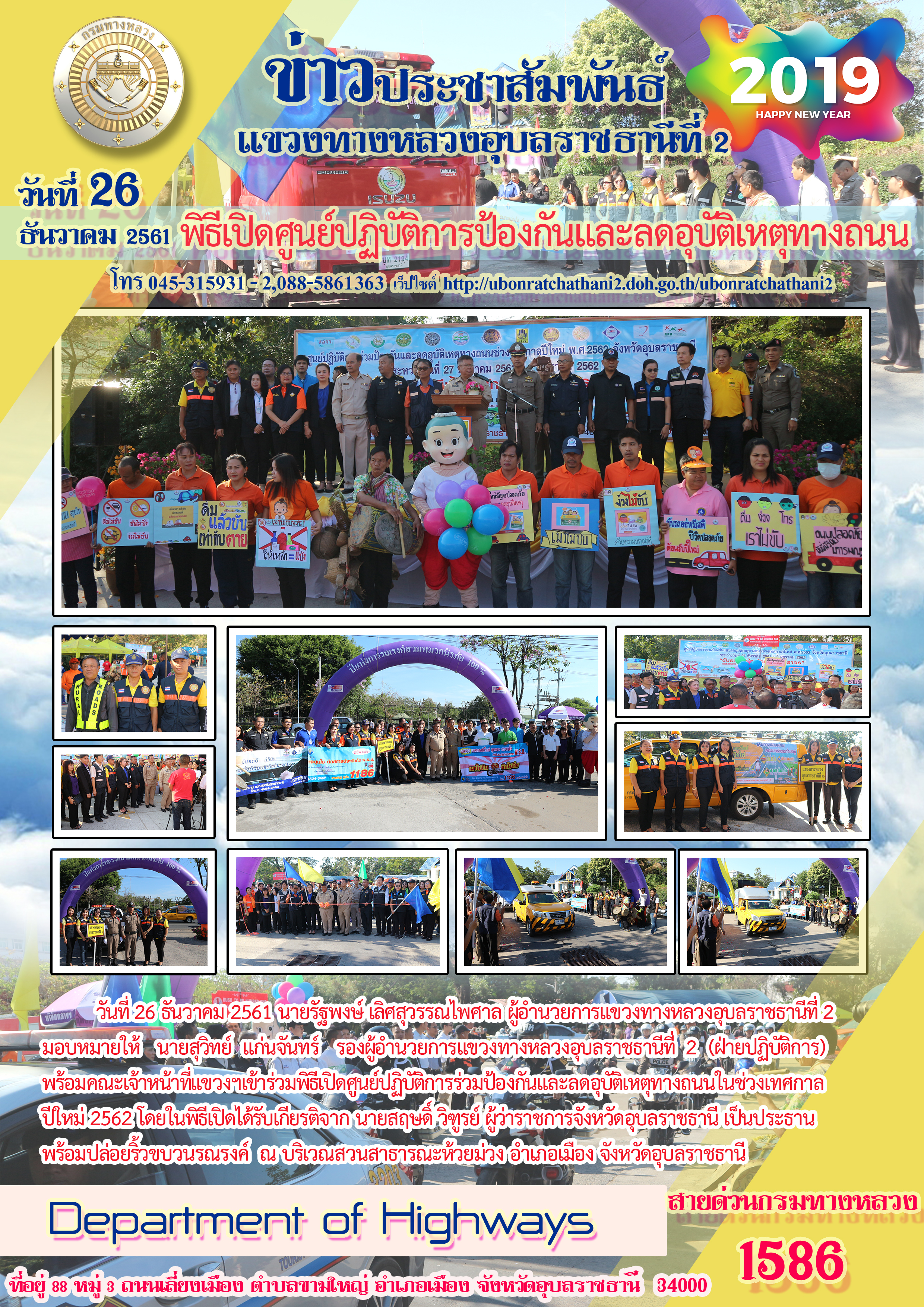 วันที่ 26 ธันวาคม 2561 นายรัฐพงษ์ เลิศสุวรรณไพศาล ผู้อำนวยการแขวงทางหลวงอุบลราชธานีที่ 2 มอบหมายให้ นายสุวิทย์ แก่นจันทร์ รองผู้อำนวยการแขวงทางหลวงอุบลราชธานีที่ 2 (ฝ่ายปฎิบัติการ)พร้อมคณะเจ้าหน้าที่แขวงฯ เข้าร่วมพิธีเปิดศูนย์ปฎิบัติการร่วมป้องกันและลดอุบัติเหตุทางถนนในช่วงเทศกาลปีใหม่ 2562 โดยในพิธีเปิดได้รับเกียรติจาก นายสฤษดิ์ วิฑูรย์ ผู้ว่าราชการจังหวัดอุบลราชธานี เป็นประธานพร้อมปล่อยริ้วขบวนรณรงค์ ณ บริเวณสวนสาธารณะห้วยม่วง อ.เมือง จ.อุบลราชธานี