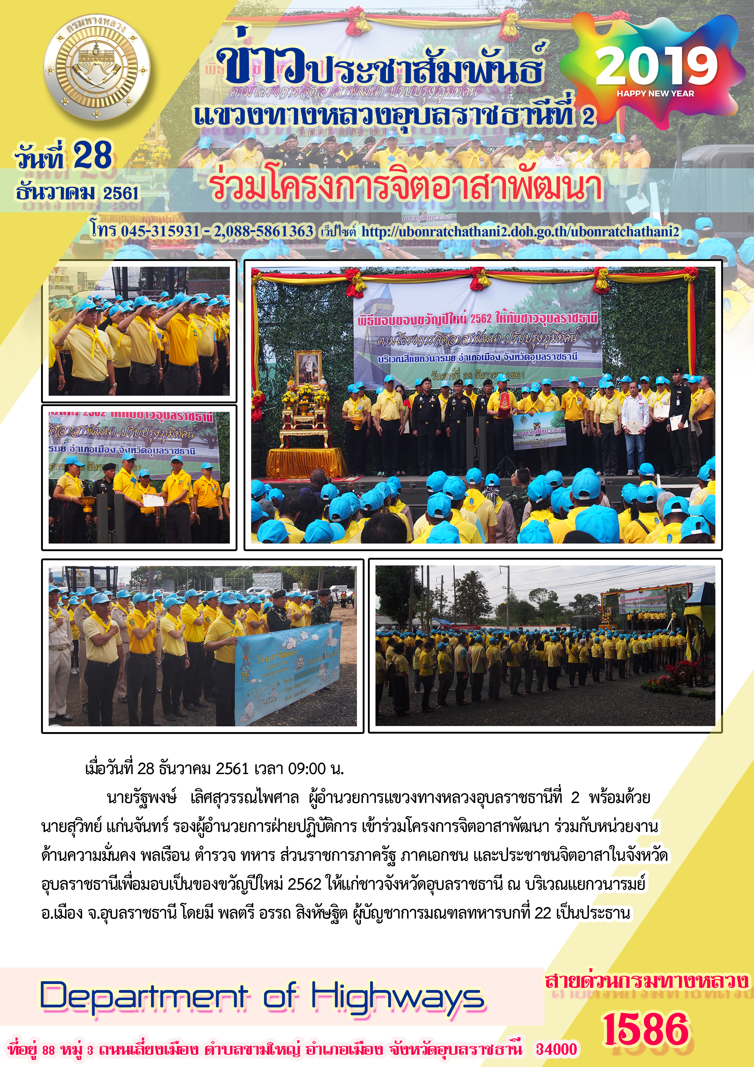 นายรัฐพงษ์ เลิศสุวรรณไพศศาล ผู้อำนวยการแขวงทางหลวงอุบลราชธานีที่ 2 พร้อมด้วยนายสุวิทย์ แก่นจันทร์ รองผู้อำนวยการฝ่ายปฏิบัติการ เข้าร่วมโครงการจิตอาสาพัฒนา ร่วมกับหน่วยงาน ด้านความมั่นคง พลเรื่อน ตำรวจ ทหาร ส่วนราชการภาครัฐ ภาคเอกชน และประชาชนจิตอาสาในจังหวัดอุบลราชธานีเพื่อมอบเป็นของขวัญปีใหม่ 2562 ให้แก่ชาวจังหวัดอุบลราชธานี ณ บริเวณแยกวนารมย์ อ.เมือง จ.อุบลราชธานี โดยมี พลตรี อรรถ สิงหัษฐิต ผู้บัญชาการมณฑลทหารบกที่ 22 เป็นประธาน
