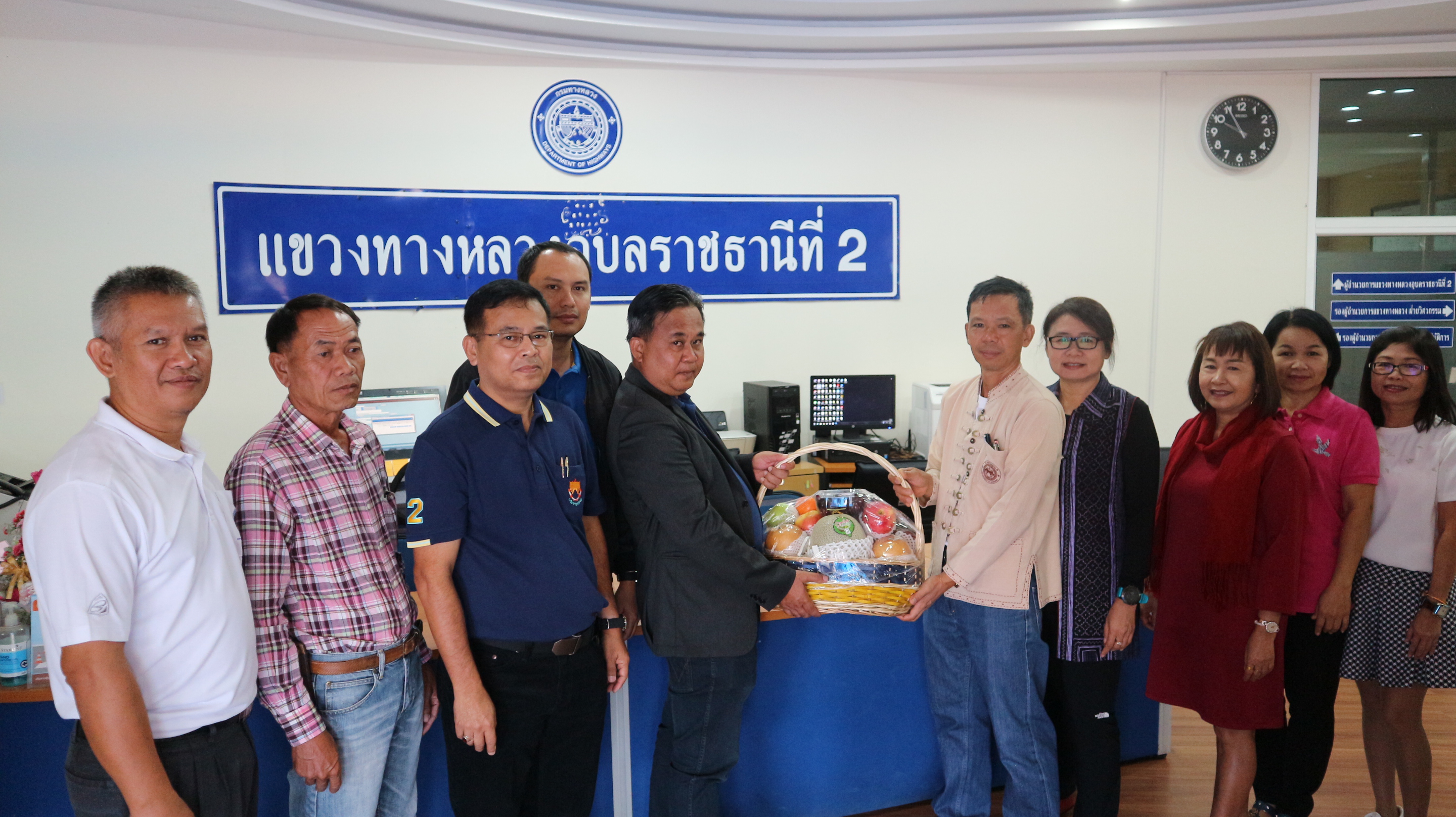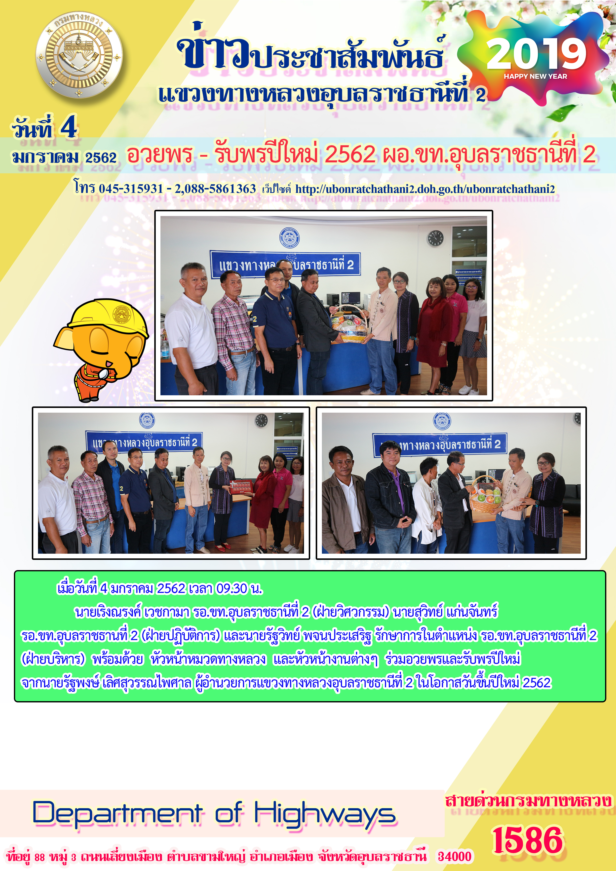 นายเริงณรงค์ เวชกามา รอ.ขท.อุบลราชธานีที่ 2 (ฝ่ายวิศวกรรม) นายสุวิทย์ แก่นจันทร์ รอ.ขท.อุบลราชธานีที่ 2 (ฝ่ายปฏิบัติการ) และนายรัฐวิทย์ พจนประเสริฐ รักษาการในตำแหน่ง รอ.ขท.อุบลราชธานีที่ 2 (ฝ่ายบริหาร) พร้อมด้วย หัวหน้าหมวดทางหลวง และหัวหน้างานต่างๆ ร่วมอวยพรและรับพรปีใหม่ จากนายรัฐพงษ์ เลิศสุวรรณไพศาล ผู้อำนวยการแขวงทางหลวงอุบลราชธานัที่ 2 ในโอกาสวันขึ้นปีใหม่ 2562
