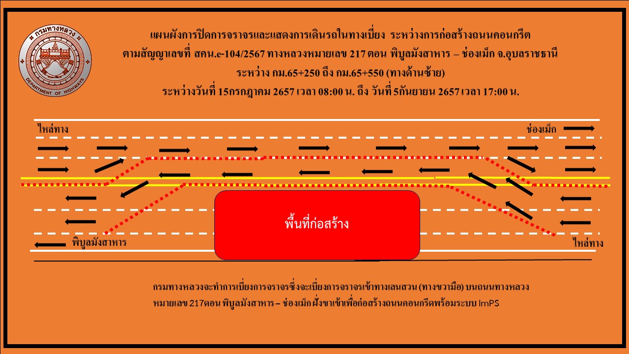 แขวงทางหลวงอุบลราชธานีที่2จะดำเนินการปิดการจราจรบนทางหลวงหมายเลข217 ตอน พิบูลมังสาหาร-ช่องเม็ก ตั้งแต่วันที่ 15 กรกฎาคม 2567-5กันยายน 2567 เพื่อให้ประชาชนผู้ใช้เส้นทางและผู้ที่เกี่ยวข้องได้ทราบ หลีกเลี่ยงการใช้เส้นทางดังกล่าว