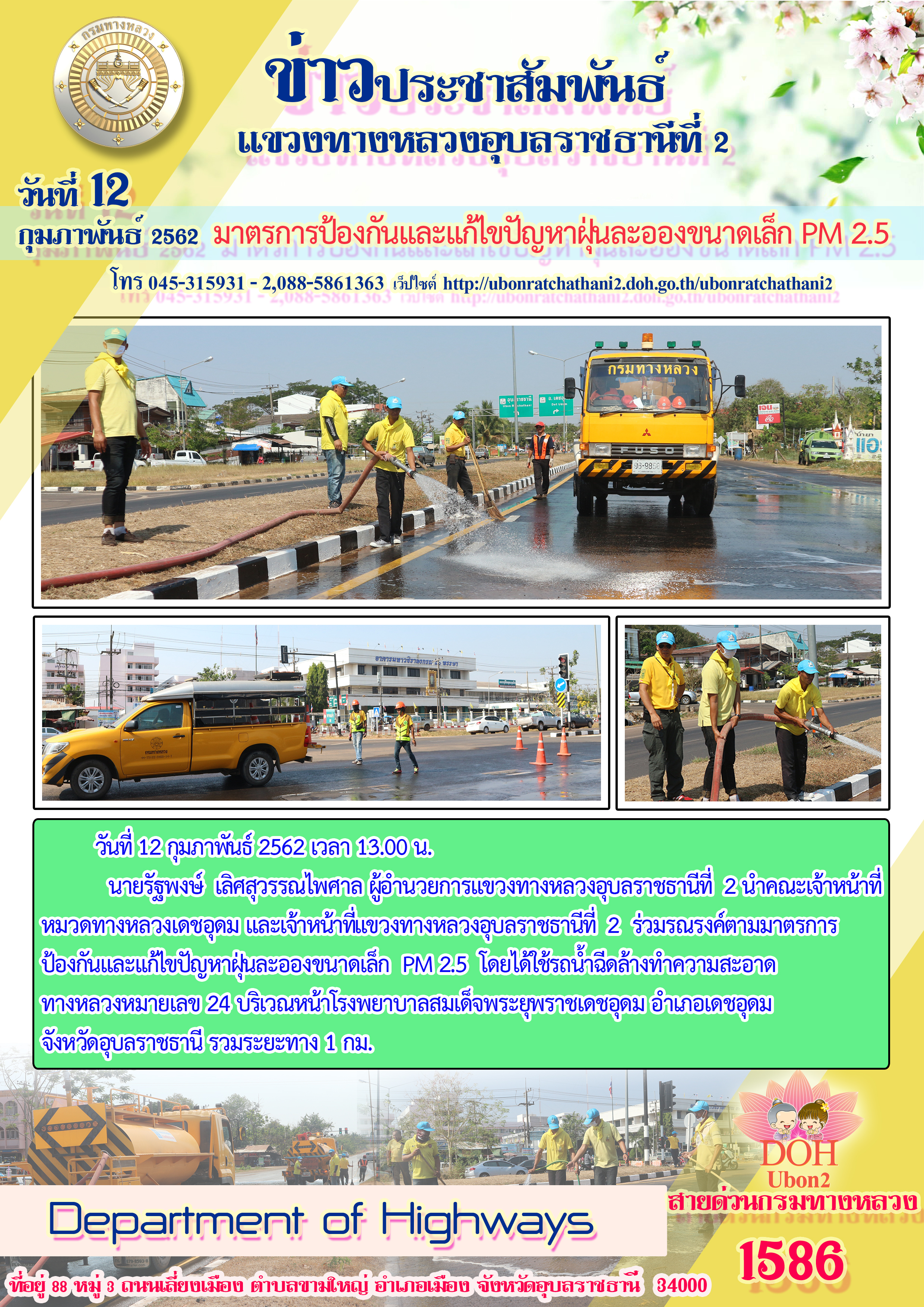 นายรัฐพงษ์ เลิศสุวรรณไพศาล ผู้อำนวยการแขวงทางหลวงอุบลราชธานีที่ 2 นำคณะเจ้าหน้าที่หมวดทางหลวงเดชอุดม และเจ้าหน้าที่แขวงทางหลวงอุบลราชธานีที่ 2 ร่วมรณรงค์ตามมาตรการป้องกันและแก้ไขปัญหาฝุ่นละอองขนาดเล็ก PM 2.5 โดยได้ใช้รถฉีดน้ำล้างทำความสะอาด ทางหลวงหมายเลข 24 บริเวณหน้าโรงพยาบาลสมเด็จพระยุพราชเดชอุดม อำเภอเดชอุดม จังหวัดอุบลราชธานี รวมระยะทาง 1 กม.