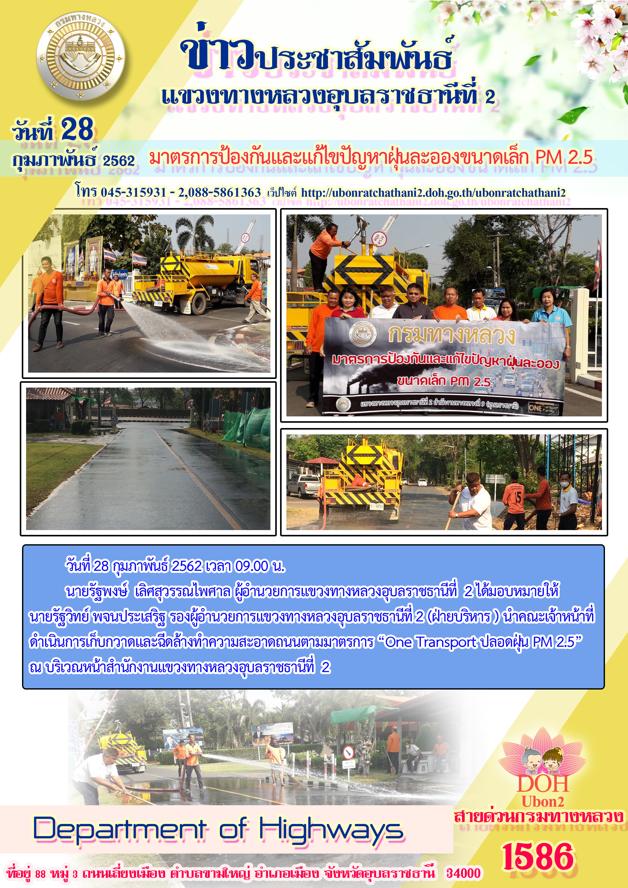 วันที่ 28 กุมภาพันธ์ 2562 เวลา 09.00 น. นายรัฐพงษ์ เลิศสุวรรณไพศาล ผู้อำนวยการแขวงทางหลวงอุบลราชธานีที่ 2 ได้มอบหมายให้ นายรัฐวิทย์ พจนประเสริฐ รองผู้อำนวยการแขวงทางหลวงอุบลราชธานีที่ 2 (ฝ่ายบริหาร ) นำคณะเจ้าหน้าที่ ดำเนินการเก็บกวาดและฉีดล้างทำความสะอาดถนนตามมาตรการ “One Transport ปลอดฝุ่น PM 2.5” ณ บริเวณหน้าสำนักงานแขวงทางหลวงอุบลราชธานีที่ 2