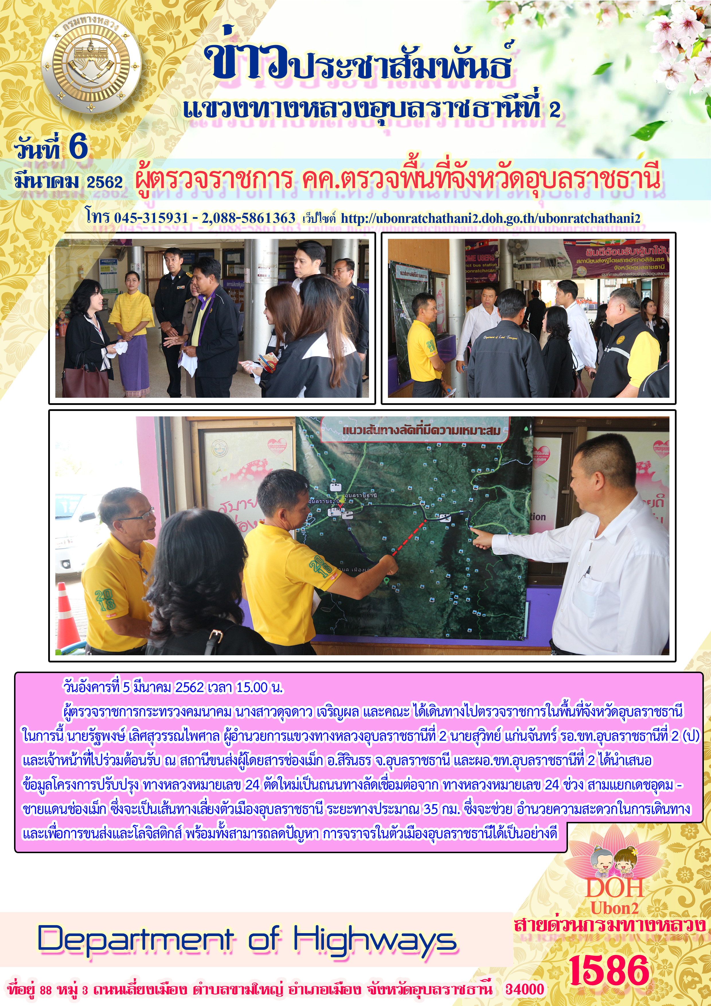ผู้ตรวจราชการกระทรวงคมนาคม นางสาวดุจดาว เจริญผล และคณะ ได้เดินทางไปตรวจราชการในพื้นที่จังหวัดอุบลราชธานี ในการนี้ นายรัฐพงษ์ เลิศสุวรรณไพศาล ผู้อำนวยการแขวงทางหลวงอุบลราชธานีที่ 2 นายสุวิทย์ แก่นจันทร์ รอ.ขท.อุบลราชธานีที่ 2 (ป) และเจ้าหน้าที่ไปร่วมต้อนรับ ณ สถานีขนส่งผู้โดยสารช่องเม็ก อ.สิรินธร จ.อุบลราชธานี และผอ.ขท.อุบลราชธานีที่ 2 ได้นำเสนอ ข้อมูลโครงการปรับปรุง ทางหลวงหมายเลข 24 ตัดใหม่เป็นถนนทางลัดเชื่อมต่อจาก ทางหลวงหมายเลข 24 ช่วง สามแยกเดชอุดม - ชายแดนช่องเม็ก ซึ่งจะเป็นเส้นทางเลี่ยงตัวเมืองอุบลราชธานี ระยะทางประมาณ 35 กม. ซึ่งจะช่วย อำนวยความสะดวกในการเดินทาง และเพื่อการขนส่งและโลจิสติกส์ พร้อมทั้งสามารถลดปัญหา การจราจรในตัวเมืองอุบลราชธานีได้เป็นอย่างดี