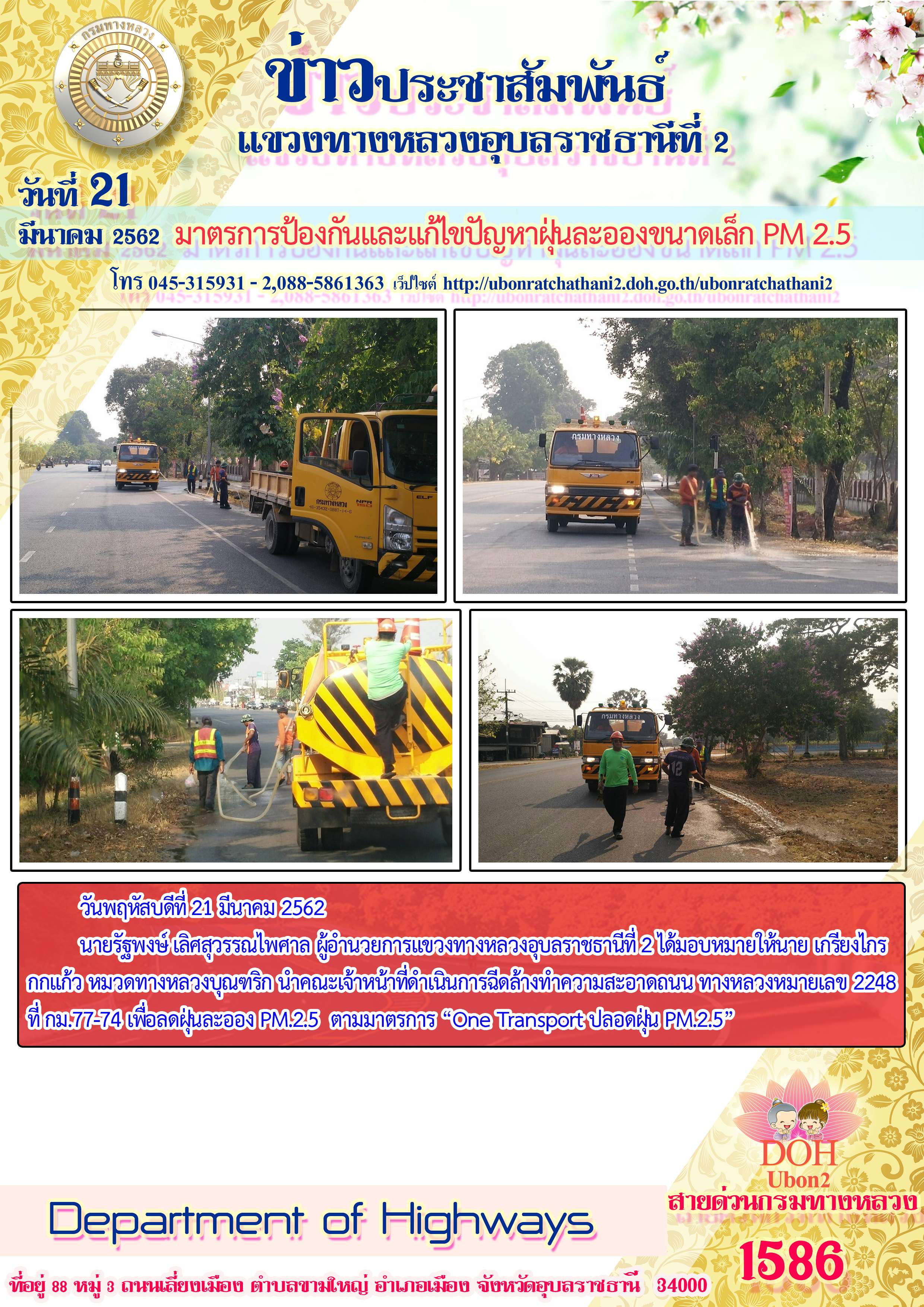 นายรัฐพงษ์ เลิศสุวรรณไพศาล ผู้อำนวยการแขวงทางหลวงอุบลราชธานีที่ 2 ได้มอบหมายให้นาย เกรียงไกร กกแก้ว หมวดทางหลวงบุณฑริก นำคณะเจ้าหน้าที่ดำเนินการฉีดล้างทำความสะอาดถนน ทางหลวงหมายเลข 2248 ที่ กม.77-74 เพื่อลดฝุ่นละออง PM.2.5 ตามมาตรการ “One Transport ปลอดฝุ่น PM.2.5”