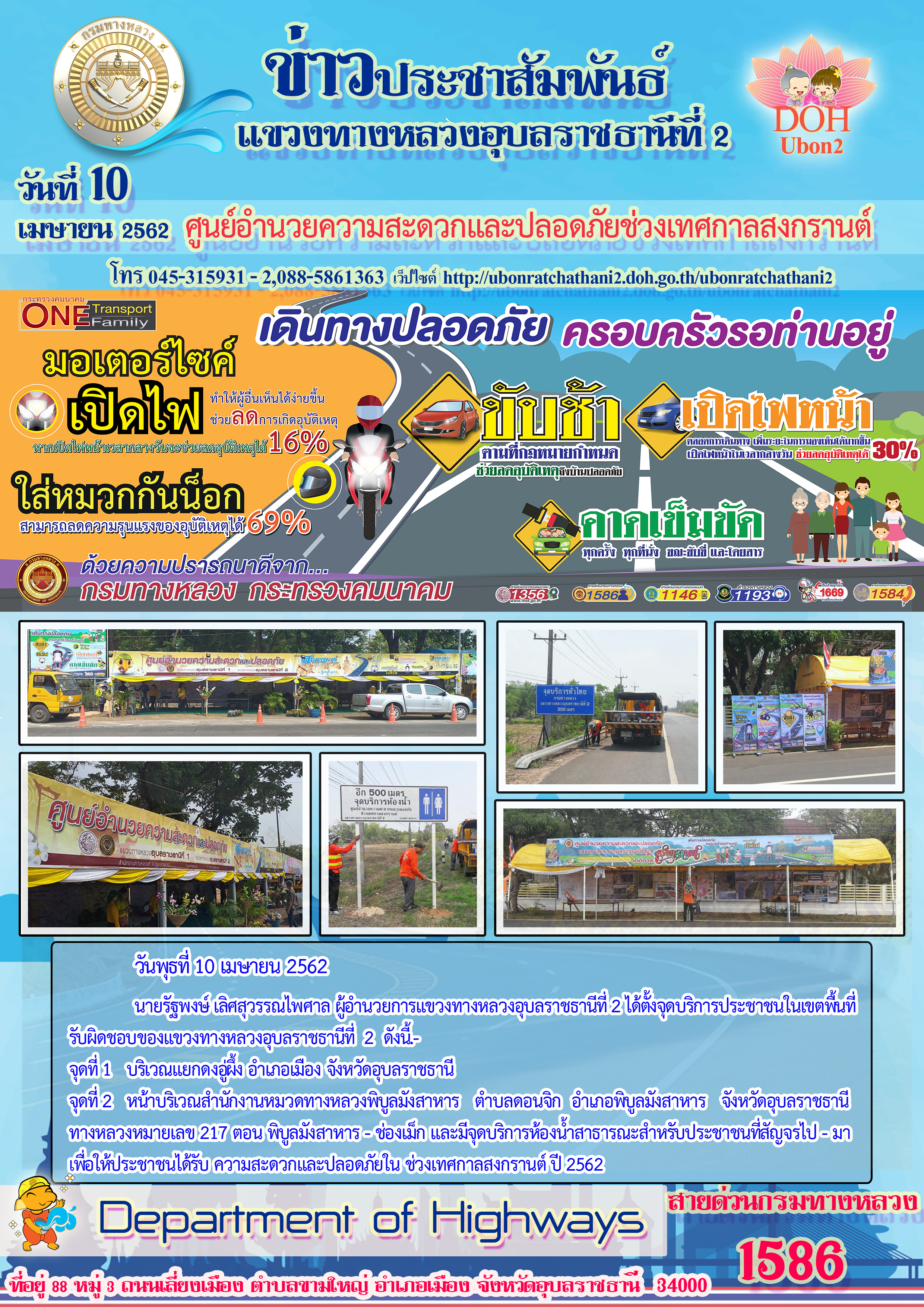 นายรัฐพงษ์ เลิศสุวรรณไพศาล ผู้อำนวยการแขวงทางหลวงอุบลราชธานีที่ 2 ได้ตั้งจุดบริการประชาชนในเขตพื้นที่รับผิดชอบของแขวงทางหลวงอุบลราชธานีที่ 2 ดังนี้.-