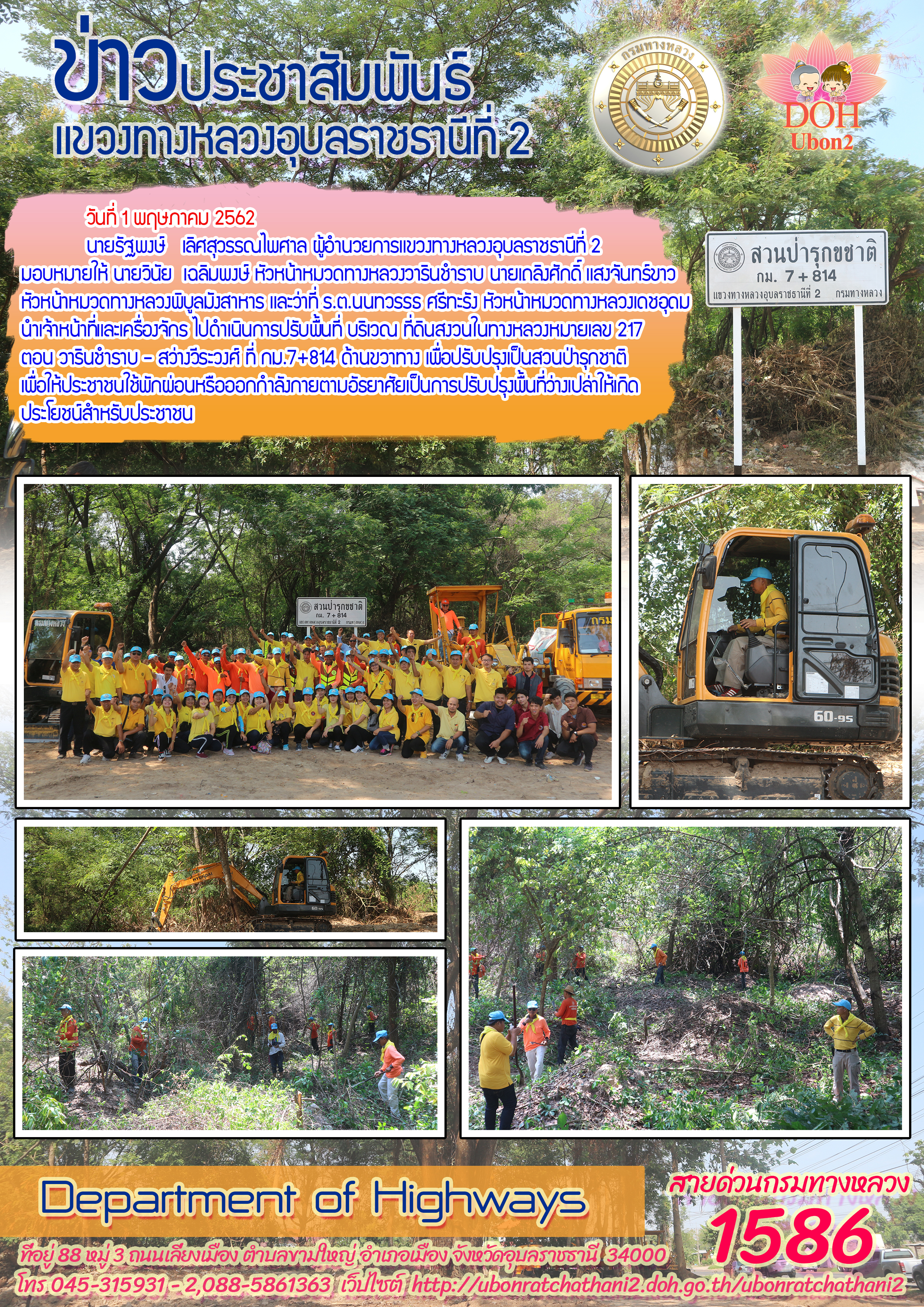 นายรัฐพงษ์ เลิศสุวรรณไพศาล ผู้อำนวยการแขวงทางหลวงอุบลราชธานีที่ 2 มอบหมายให้ นายวินัย เฉลิมพงษ์ หัวหน้าหมวดทางหลวงวารินชำราบ นายเถลิงศักดิ์ แสงจันทร์ขาว หัวหน้าหมวดทางหลวงพิบูลมังสาหาร และว่าที่ ร.ต.นนทวรรธ ศรีทะรัง หัวหน้าหมวดทางหลวงเดชอุดม นำเจ้าหน้าที่และเครื่องจักร ไปดำเนินการปรับพื้นที่ บริเวณ ที่ดินสงวนในทางหลวงหมายเลข 217 ตอน วารินชำราบ - สว่างวีระวงศ์ ที่ กม.7+814 ด้านขวาทาง เพื่อปรับปรุงเป็นสวนป่ารุกชาติ เพื่อให้ประชาชนใช้พักผ่อนหรือออกกำลังกายตามอัธยาศัยเป็นการปรับปรุงพื้นที่ว่างเปล่าให้เกิดประโยชน์สำหรับประชาชน