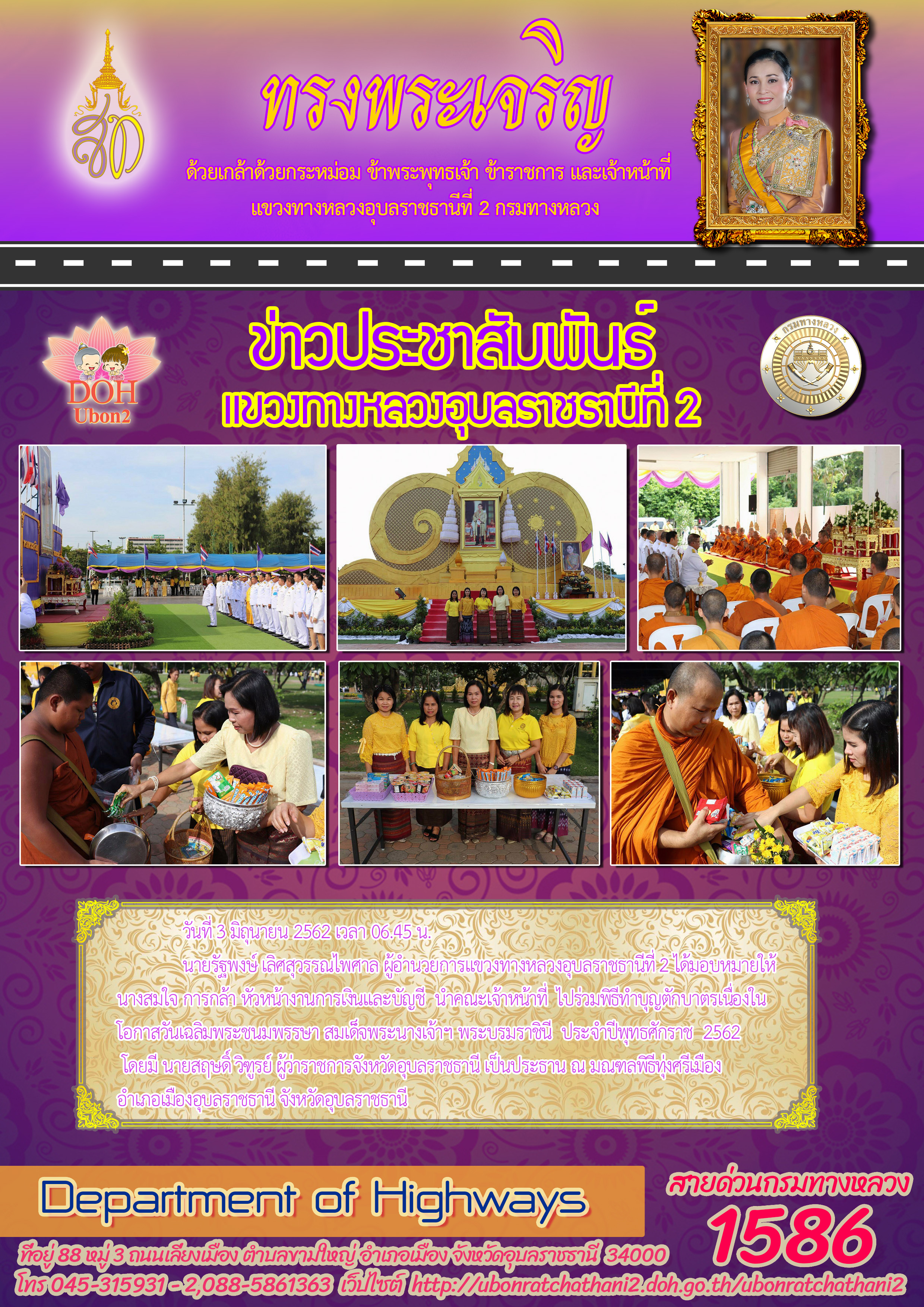 นายรัฐพงษ์ เลิศสุวรรณไพศาล ผู้อำนวยการแขวงทางหลวงอุบลราชธานีที่ 2 ได้มอบหมายให้ นางสมใจ การกล้า หัวหน้างานการเงินและบัญชี นำคณะเจ้าหน้าที่ ไปร่วมพิธีทำบุญตักบาตรเนื่องใน โอกาสวันเฉลิมพระชนมพรรษา สมเด็็จพระนางเจ้าฯ พระบรมราชินี ประจำปีพุทธศักราช 2562 โดยมี นายสฤษดิ์ วิฑูรย์ ผู้ว่าราชการจังหวัดอุบลราชธานี เป็นประธาน ณ มณฑลพิธีทุ่งศรีเมือง อำเภอเมืองอุบลราชธานี จังหวัดอุบลราชธานี