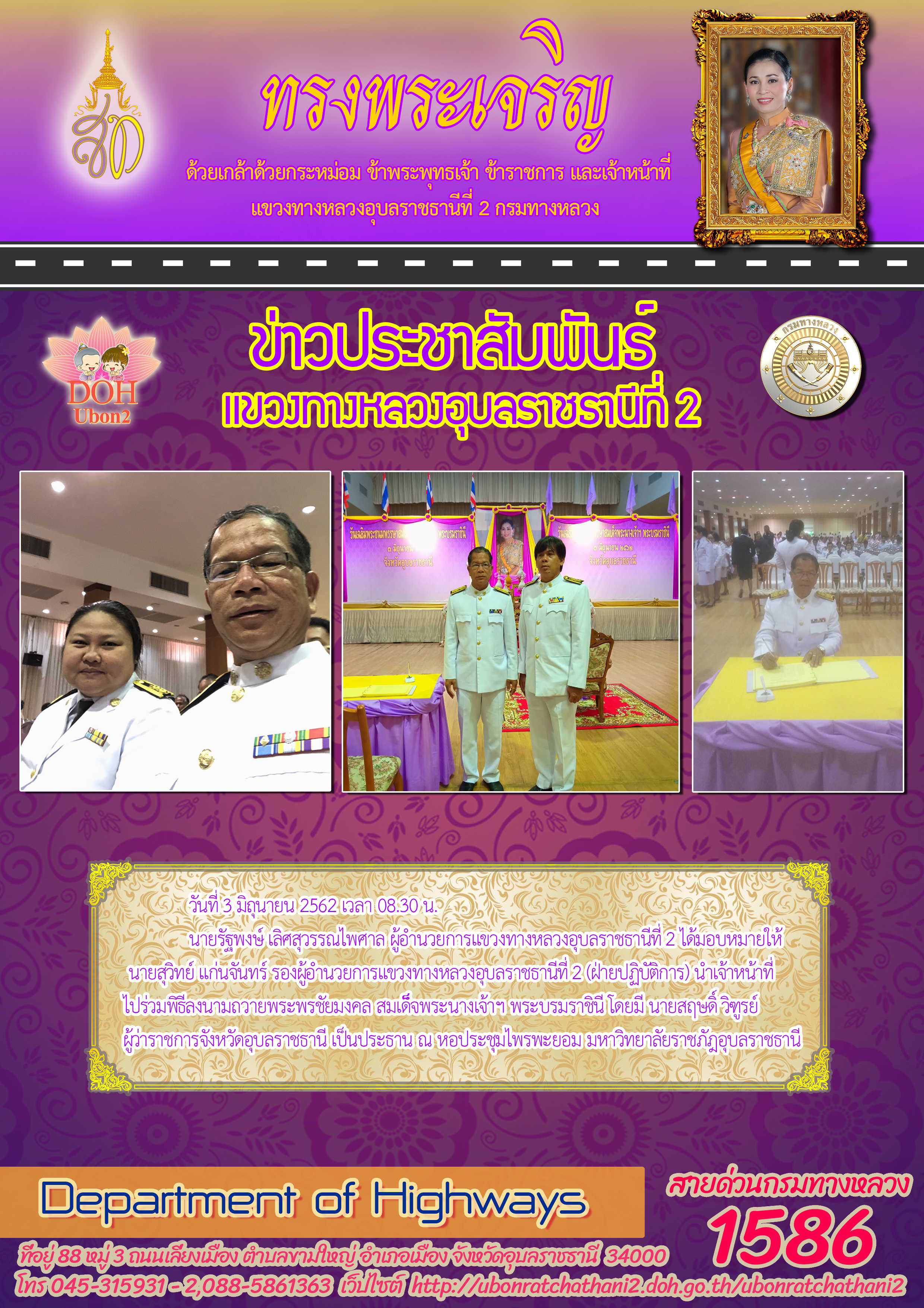 นายรัฐพงษ์ เลิศสุวรรณไพศาล ผู้อำนวยการแขวงทางหลวงอุบลราชธานีที่ 2 ได้มอบหมายให้นายสุวิทย์ แก่นจันทร์ รองผู้อำนวยการแขวงทางหลวงอุบลราชธานีที่ 2 (ฝ่ายปฏิบัติการ) นำเจ้าหน้าที่ ไปร่วมพิธีลงนามถวายพระพรชัยมงคล สมเด็็จพระนางเจ้าฯ พระบรมราชินี โดยมี นายสฤษดิ์ วิฑูรย์ ผู้ว่าราชการจังหวัดอุบลราชธานี เป็นประธาน ณ หอประชุมไพรพะยอม มหาวิทยาลัยราชภัฎอุบลราชธานี